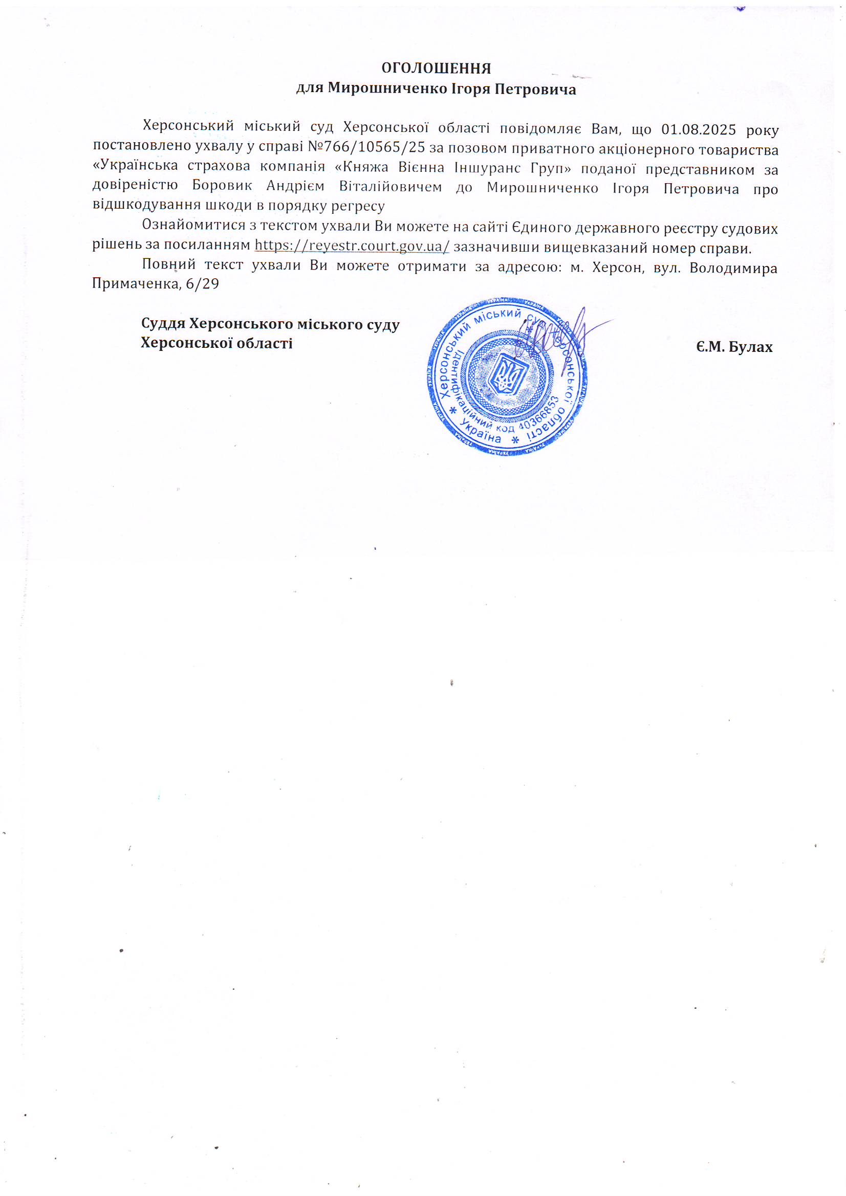 Оголошення для Мирошниченка Ігоря Петровича про постановлення ухвали