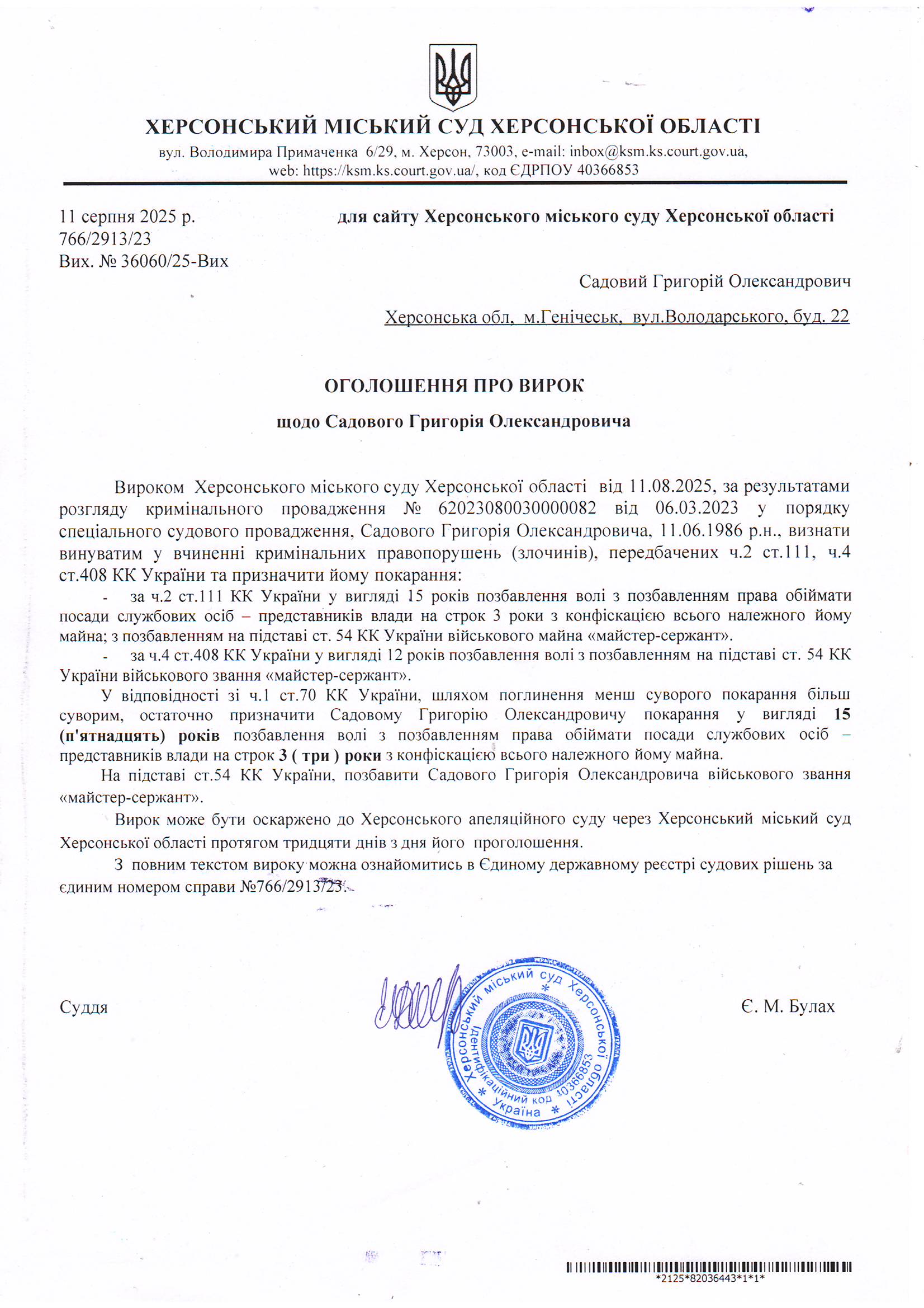Оголошення для Садового Григорія Олександровича про ухваленення вироку