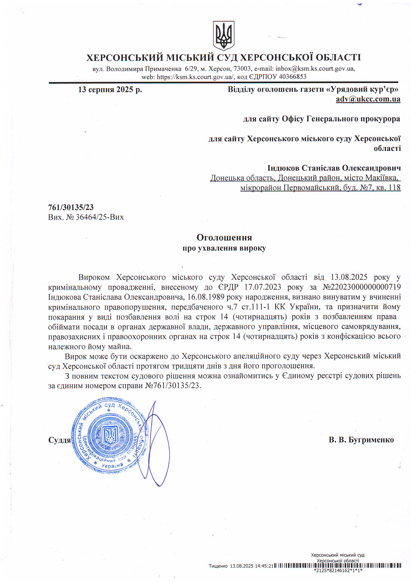 Оголошення для Індюкова Станіслава Олександровича про ухвалення вироку