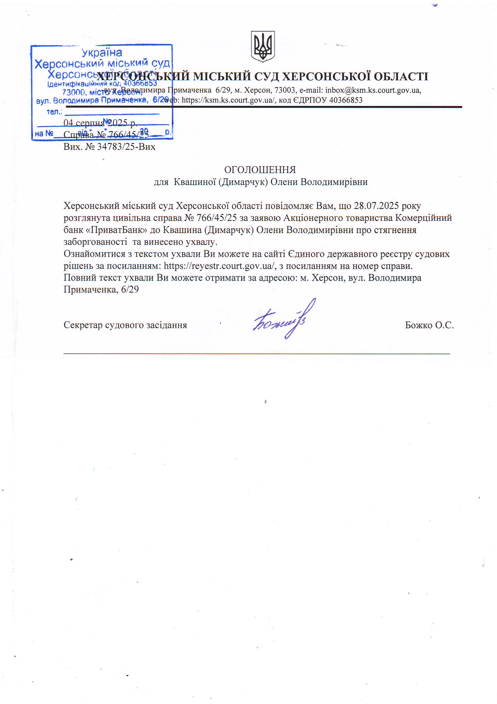 Оголошення для Квашиної (Димарчук) Олени Володимирівни