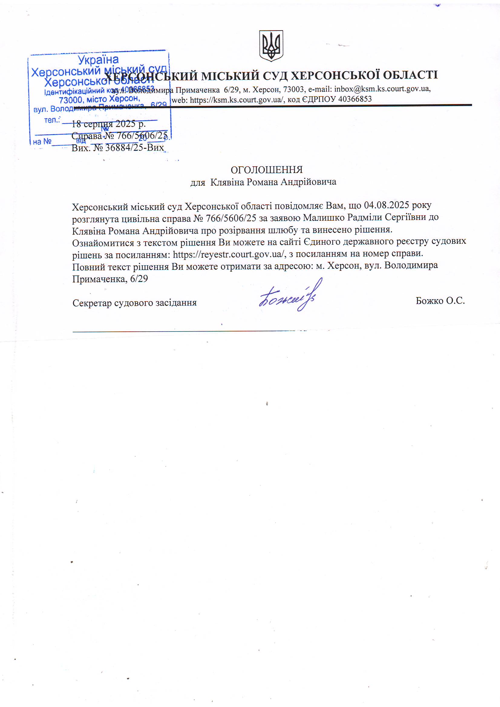 Оголошення для Клявіна Романа Андрійовича про винесення рішення