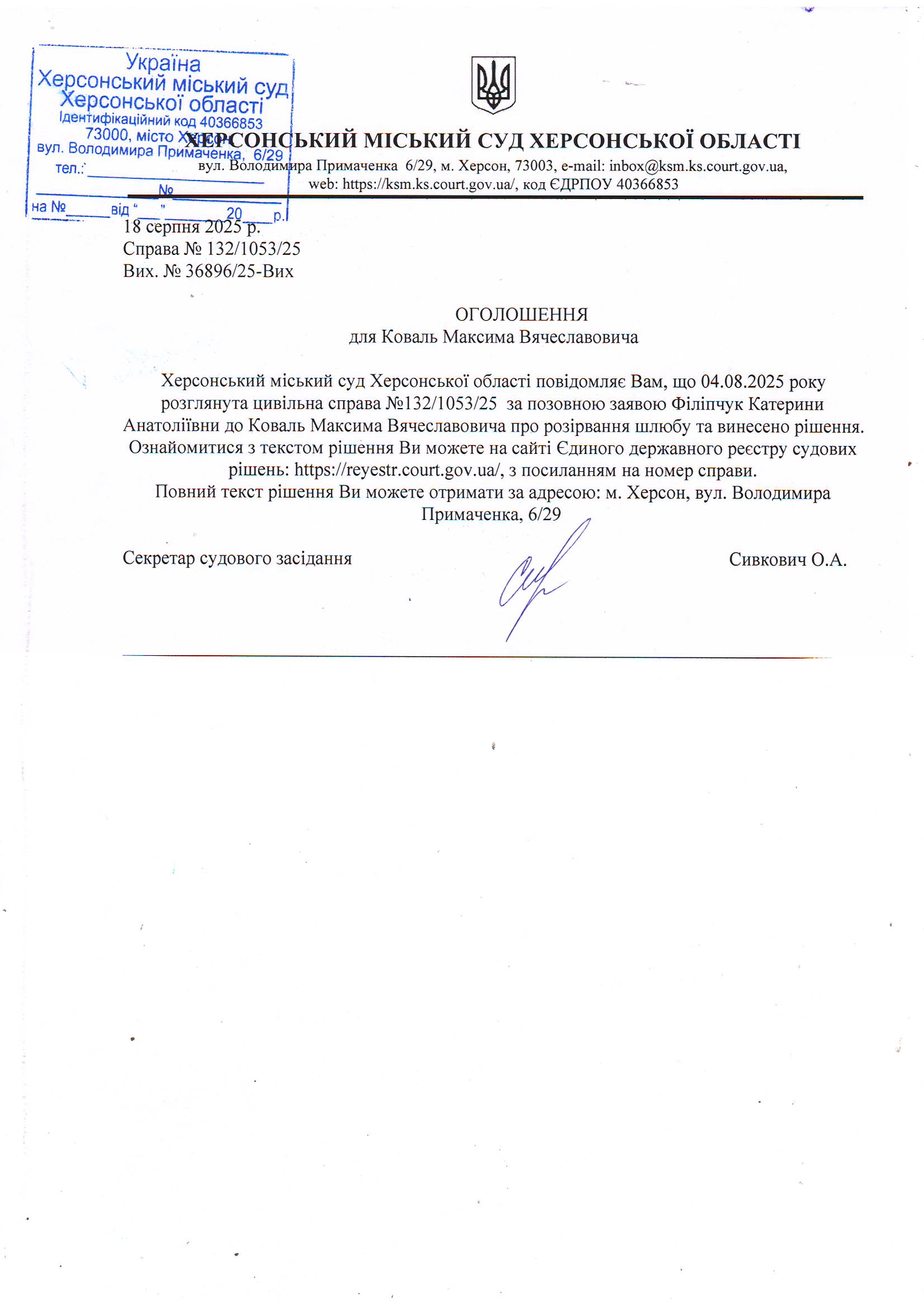 Оголошення для Коваля Максима Вячеславовича про винесення рішення