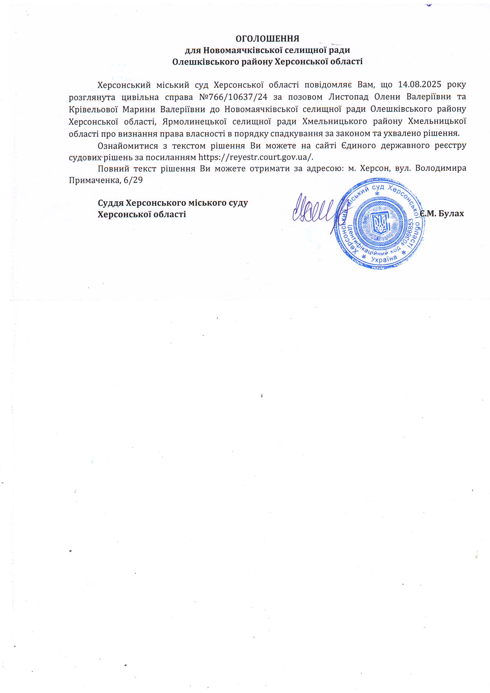 Оголошення для Новомаячківської селищної ради Олешківського району Херсонської області про ухвалення рішення