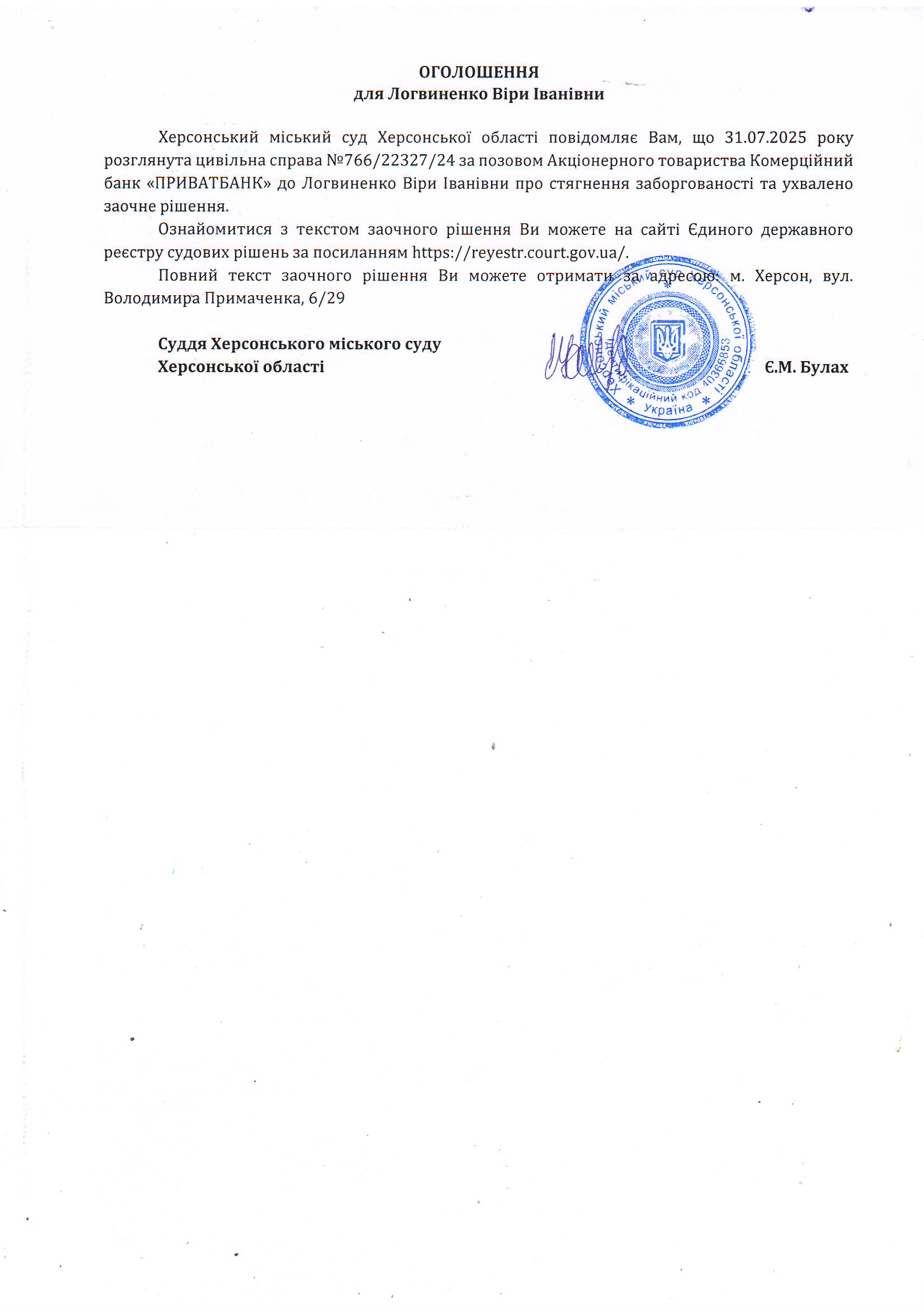 Оголошення для Логвиненко Віри Іванівни про ухвалення заочного рішення