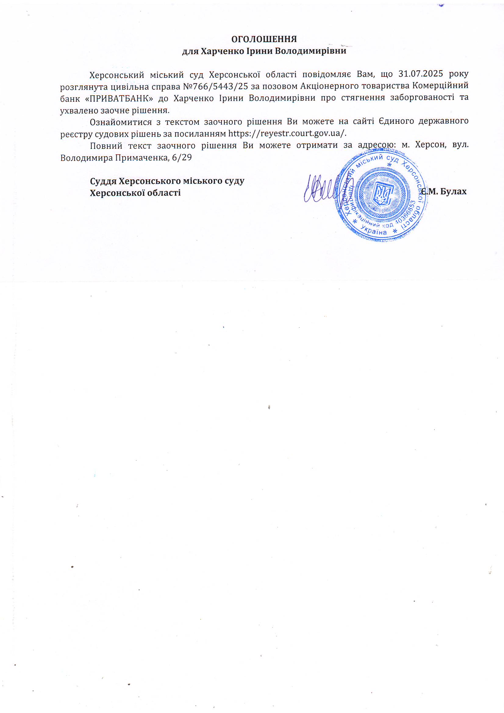 Оголошення для Харченко Ірини Володимирівни про ухвалення заочного рішення