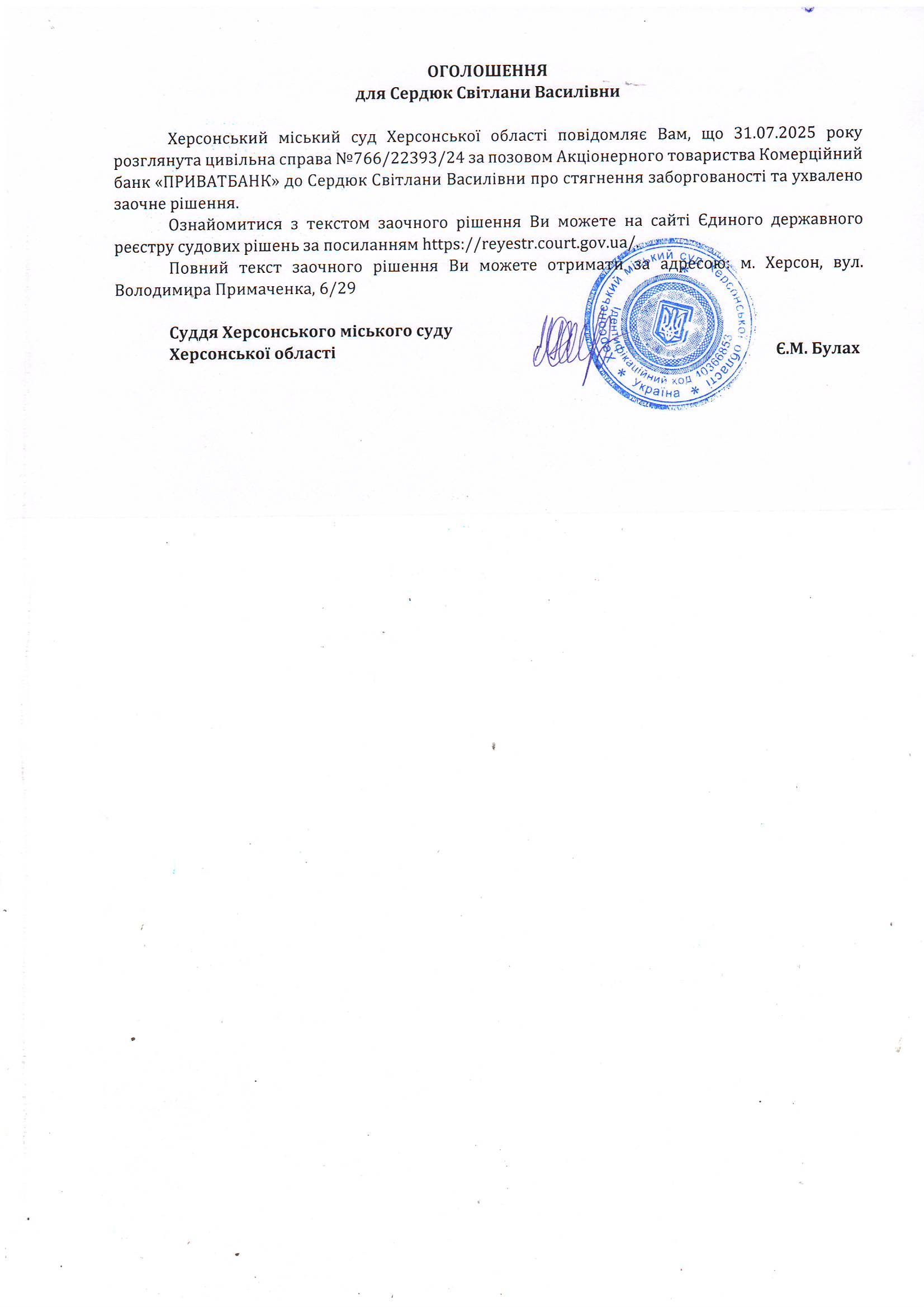 Оголошення для Сердюк Світлани Василівни про ухвалення заочного рішення