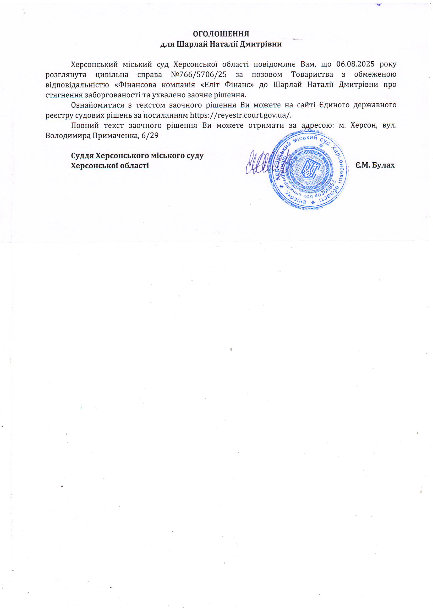 Оголошення для Шарлай Наталії Дмитрівни про ухвалення заочного рішення