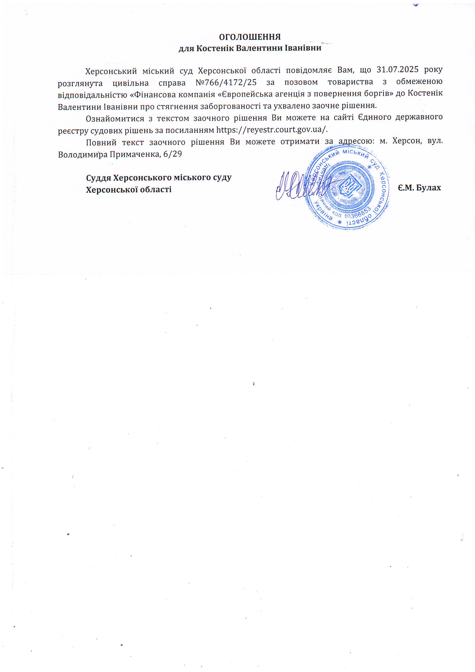 Оголошення для Костенік Валентини Іванівни про ухвалення заочного рішення