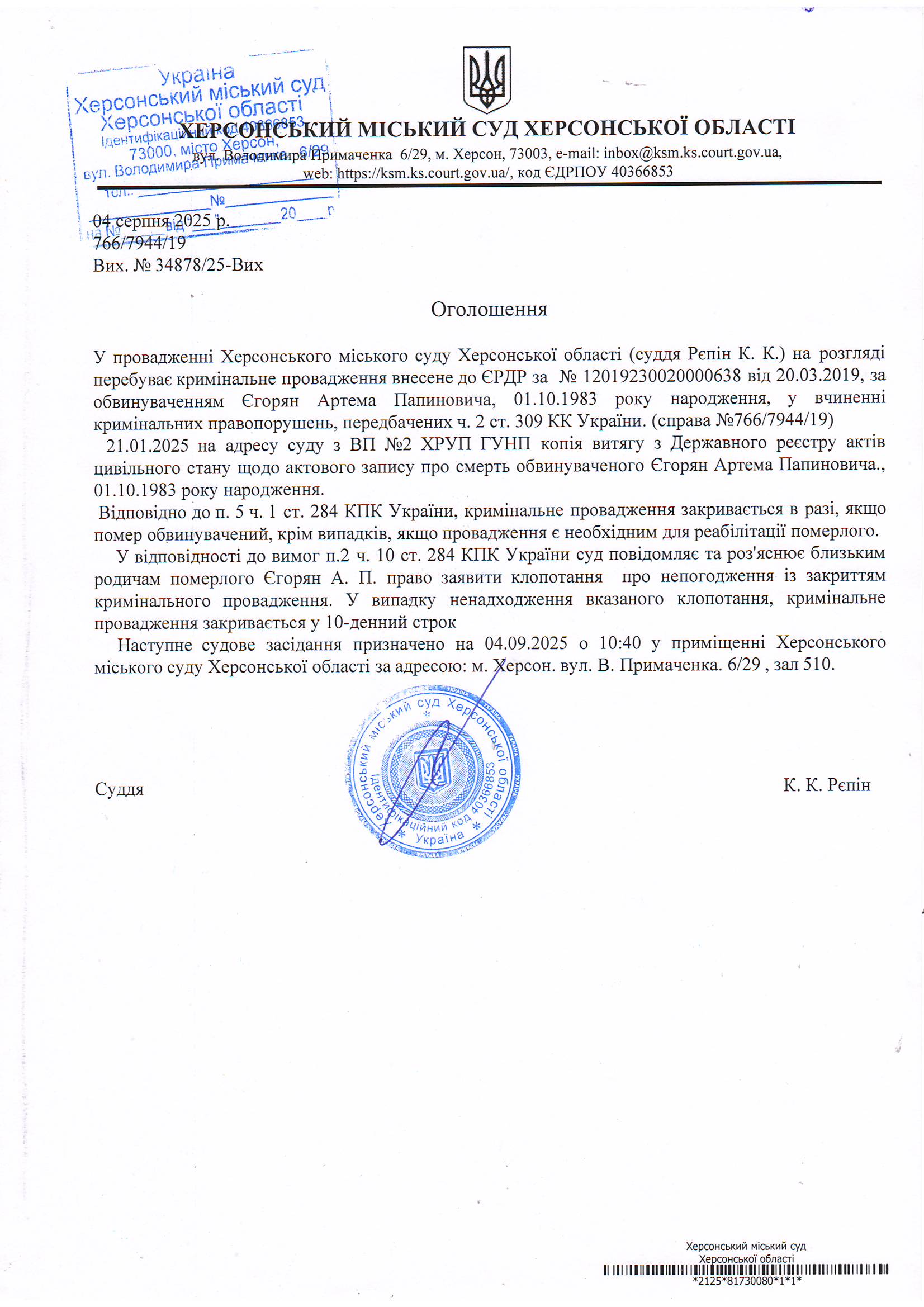 Оголошення про виклик особи в суд та повідомлення про судове рішення