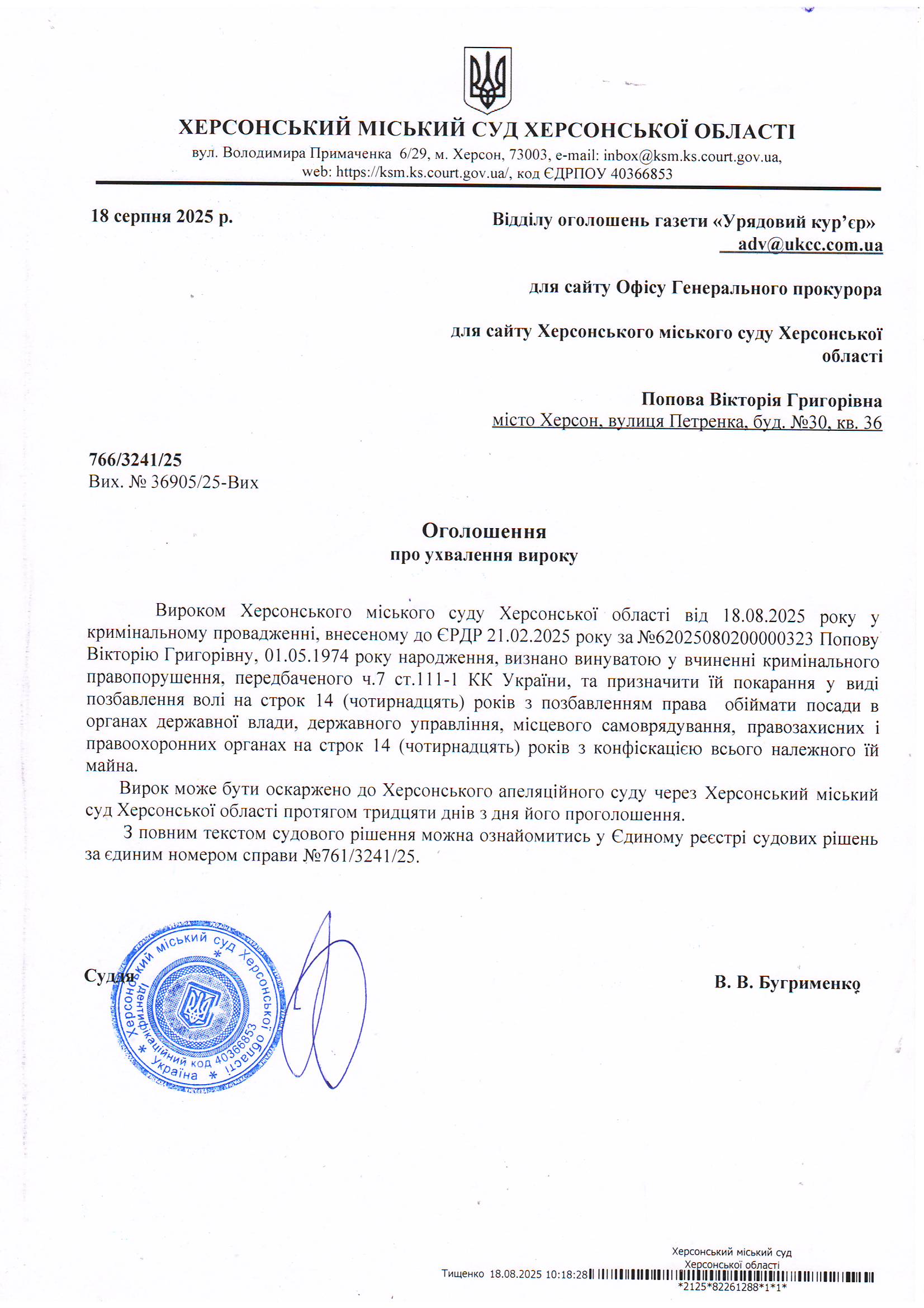 Оголошення для Попової Вікторії Вікторівни про ухвалення вироку