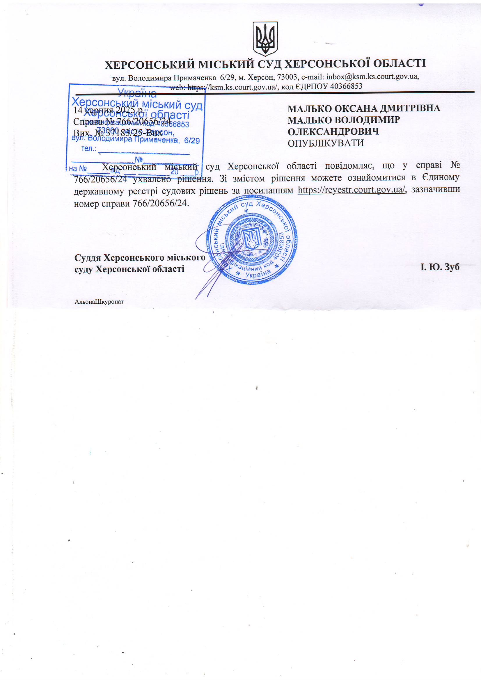 Оголошення для Малько Оксани Дмитрівни, Малька Володимира Олександровича про ухвалення рішення