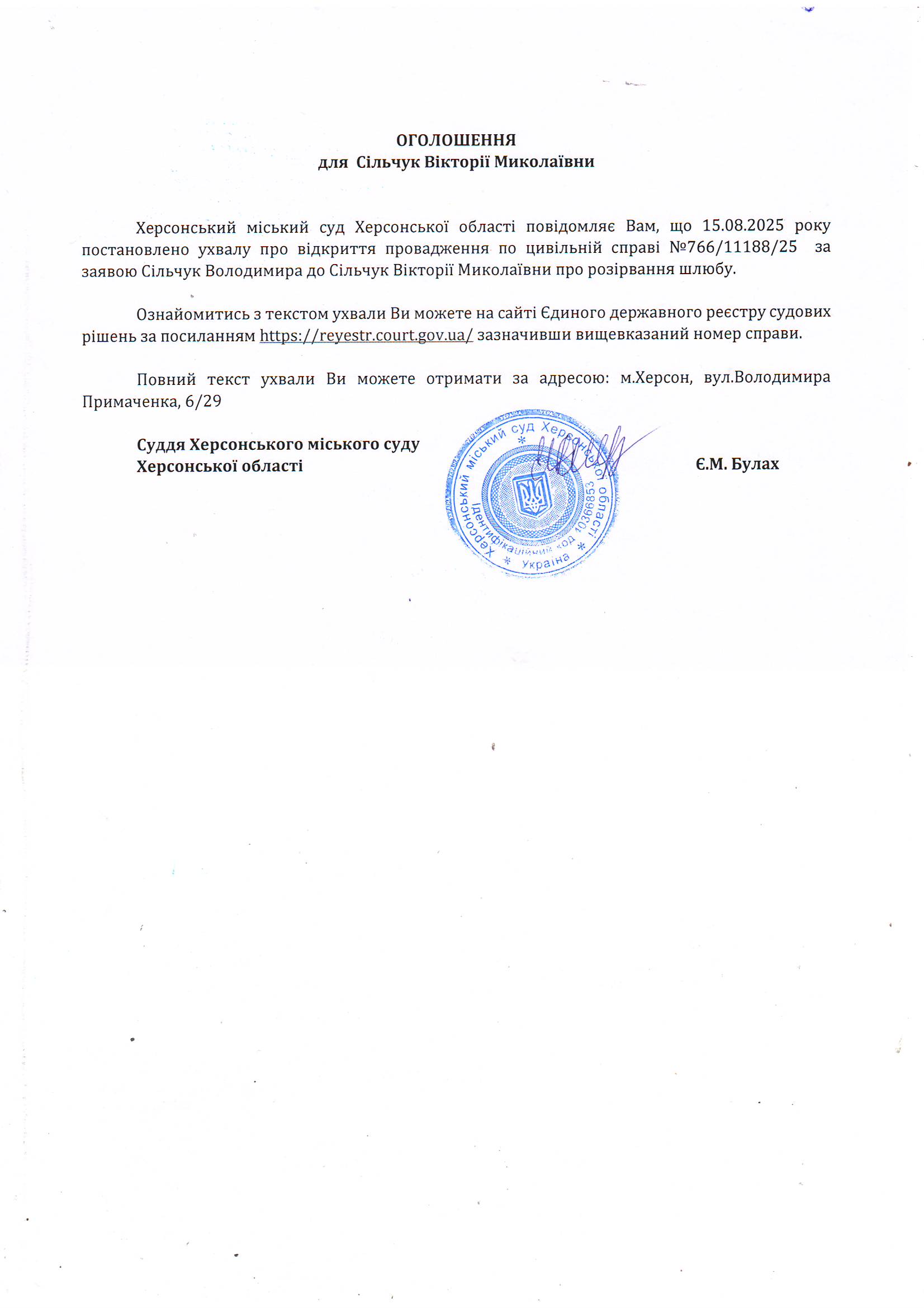 Оголошення для Сільчук Вікторії Миколаївни про постановлення ухвали