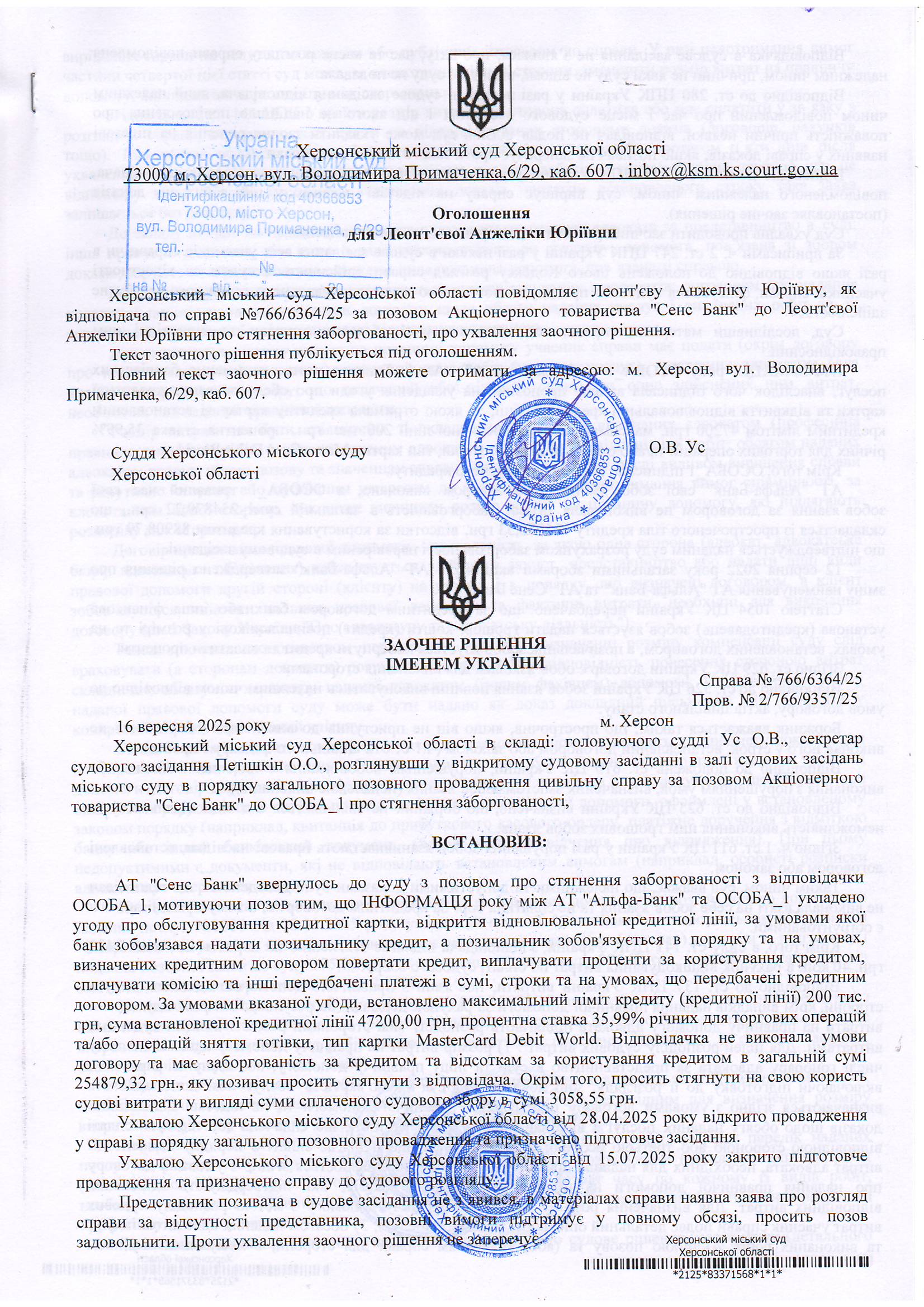 Оголошення для Леонт'євої Анжеліки Юріївни про ухвалення заочного рішення