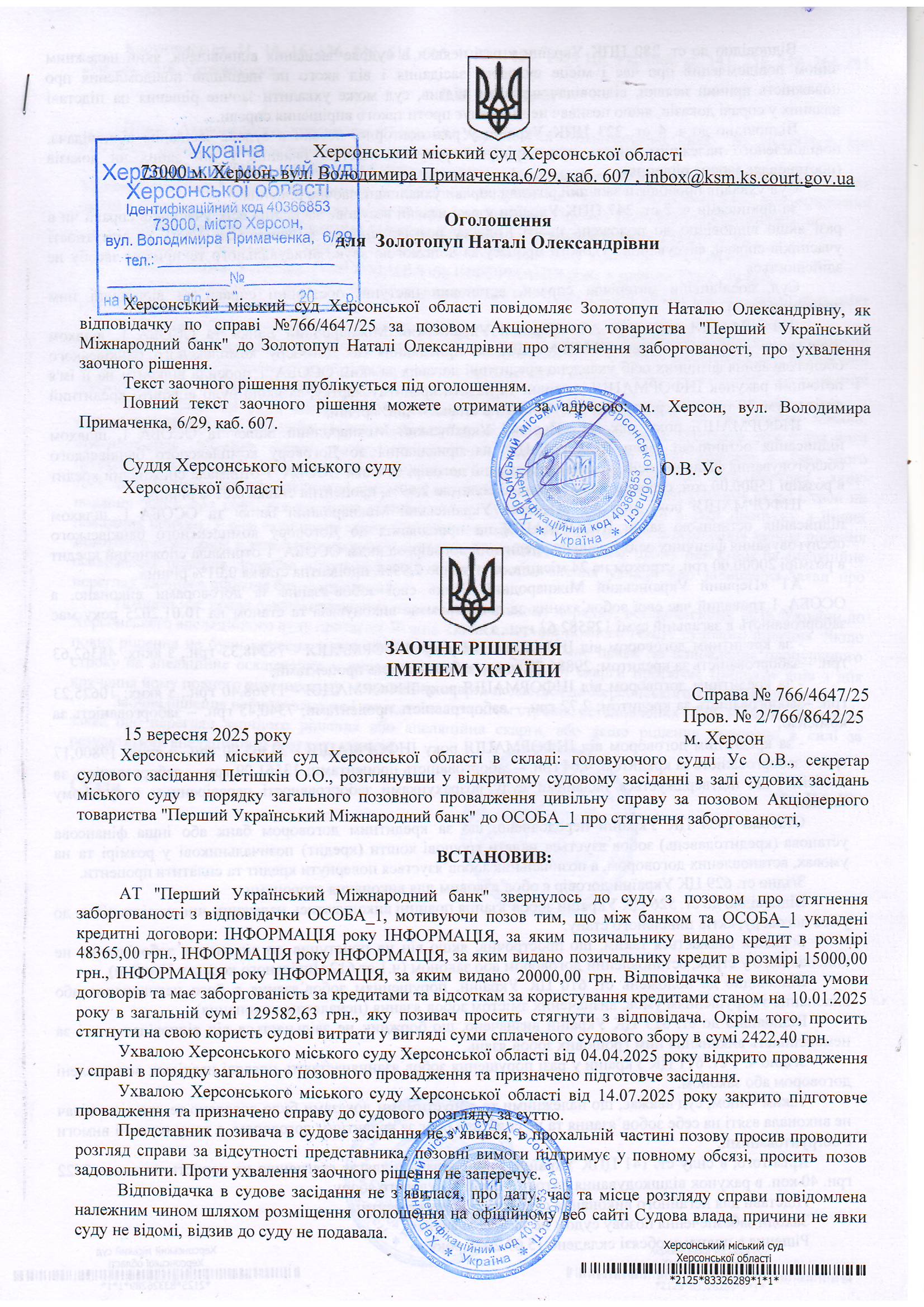 Оголошення для Золотопуп Наталі Олександрівни про ухвалення заочного рішення