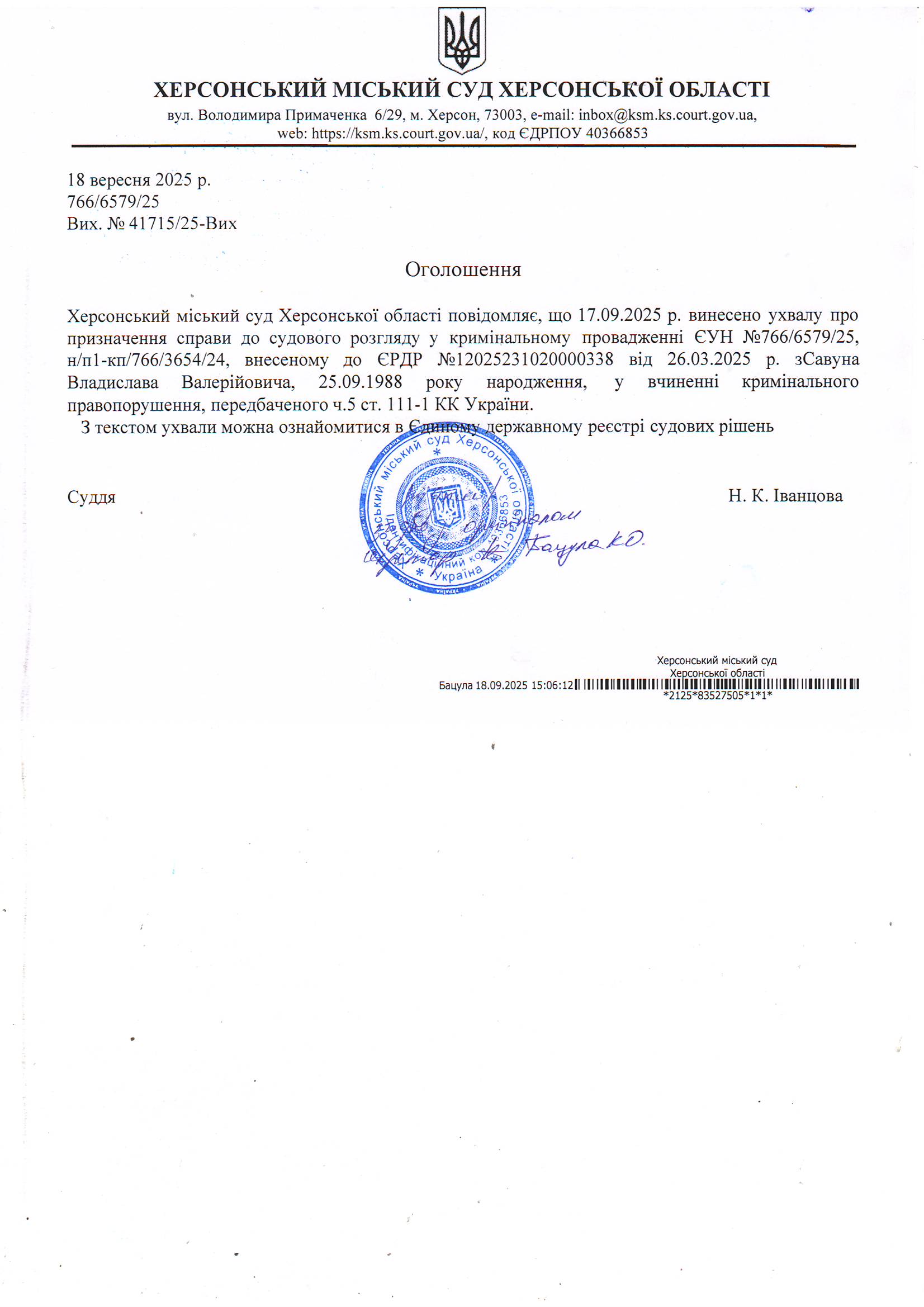 Оголошення для Савуна Владислава Валерійовича про винесення ухвали