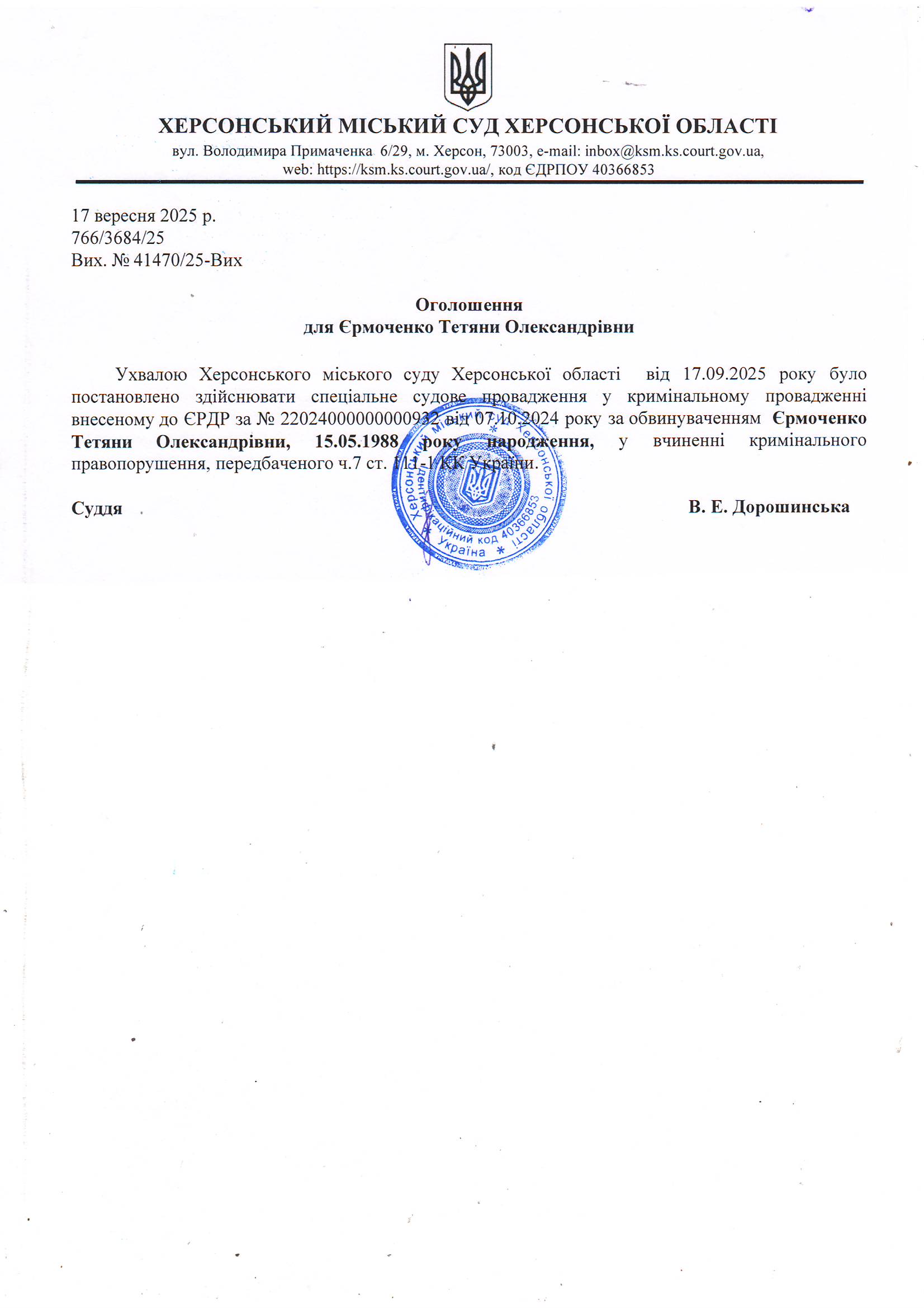 Оголошення для Єрмоченко Тетяни Олександрівни