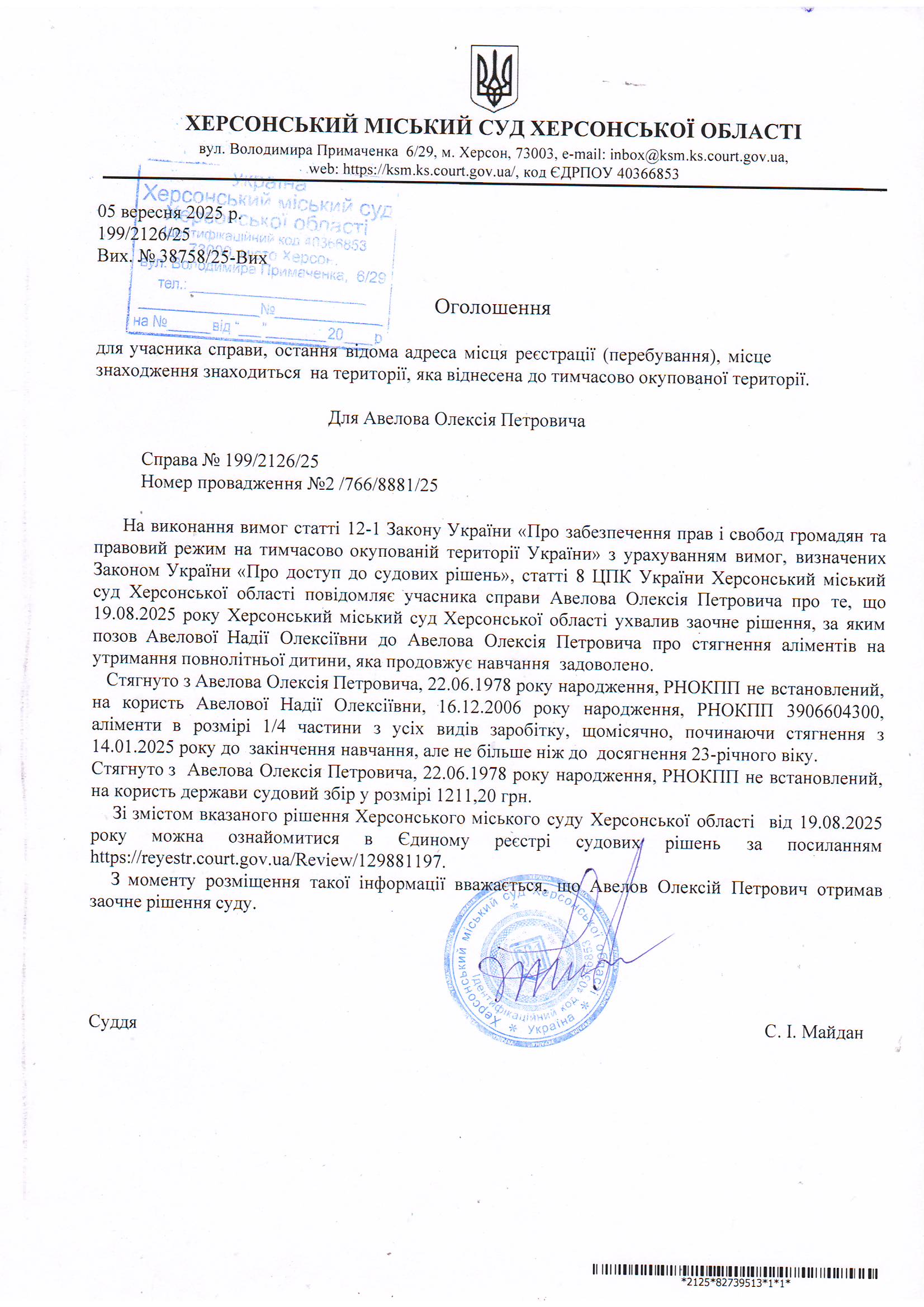 Оголошення для Авелова Олексія Петровича про ухвалення заочного рішення