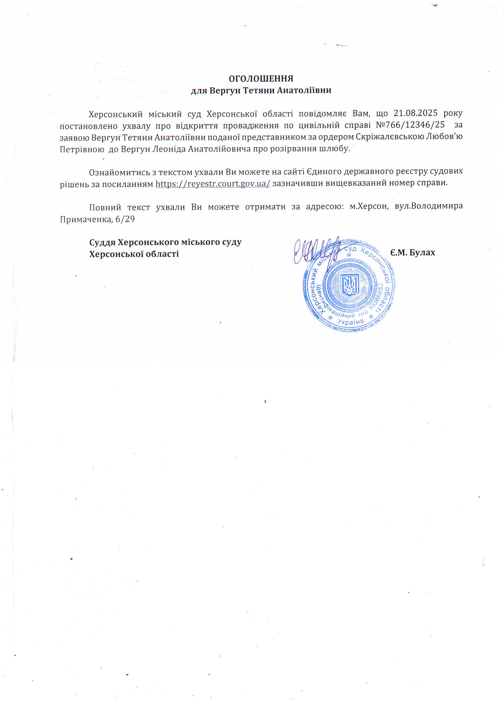 Оголошення для Вергун Тетяни Анатоліївни про постановлення ухвали
