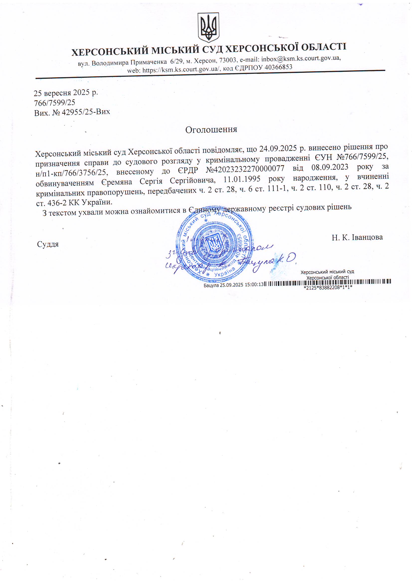 Оголошення для Єремяна Сергія Сергійовича