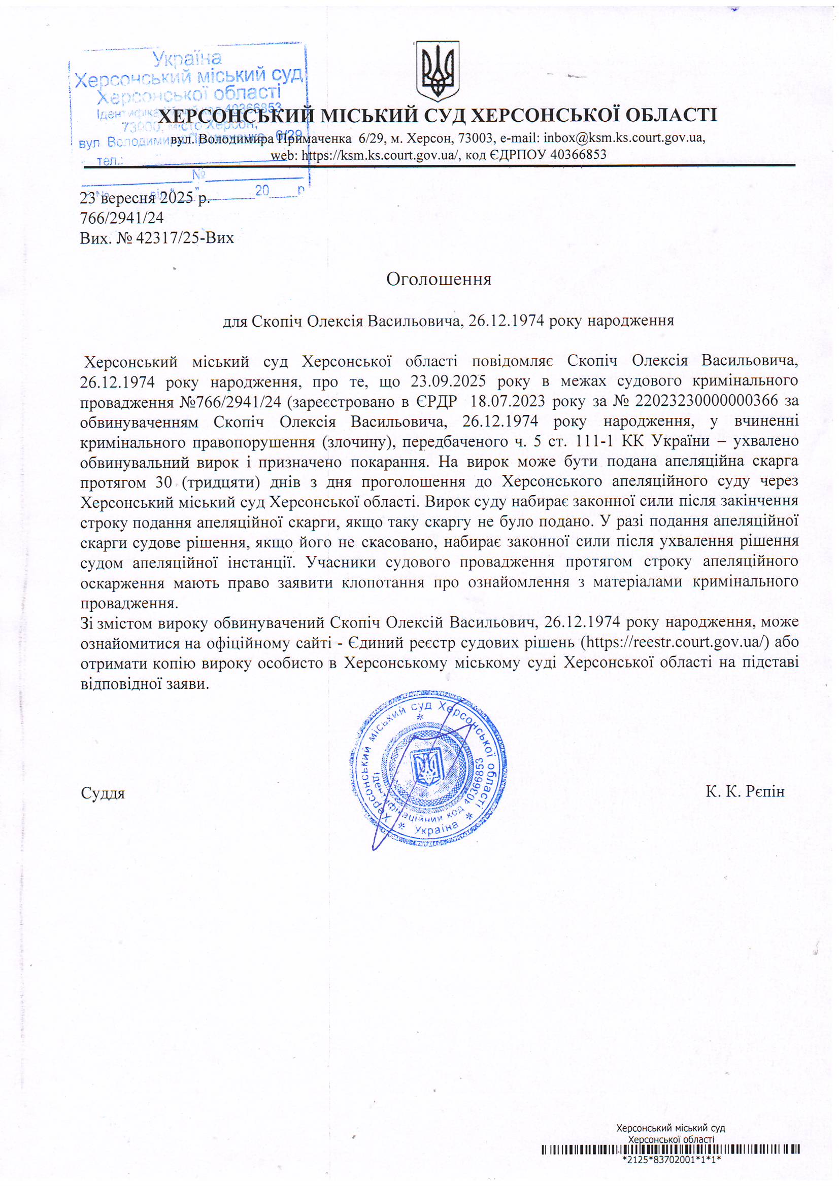 Оголошення для Скопіча Олексія Васильовича про ухвалення виркоу