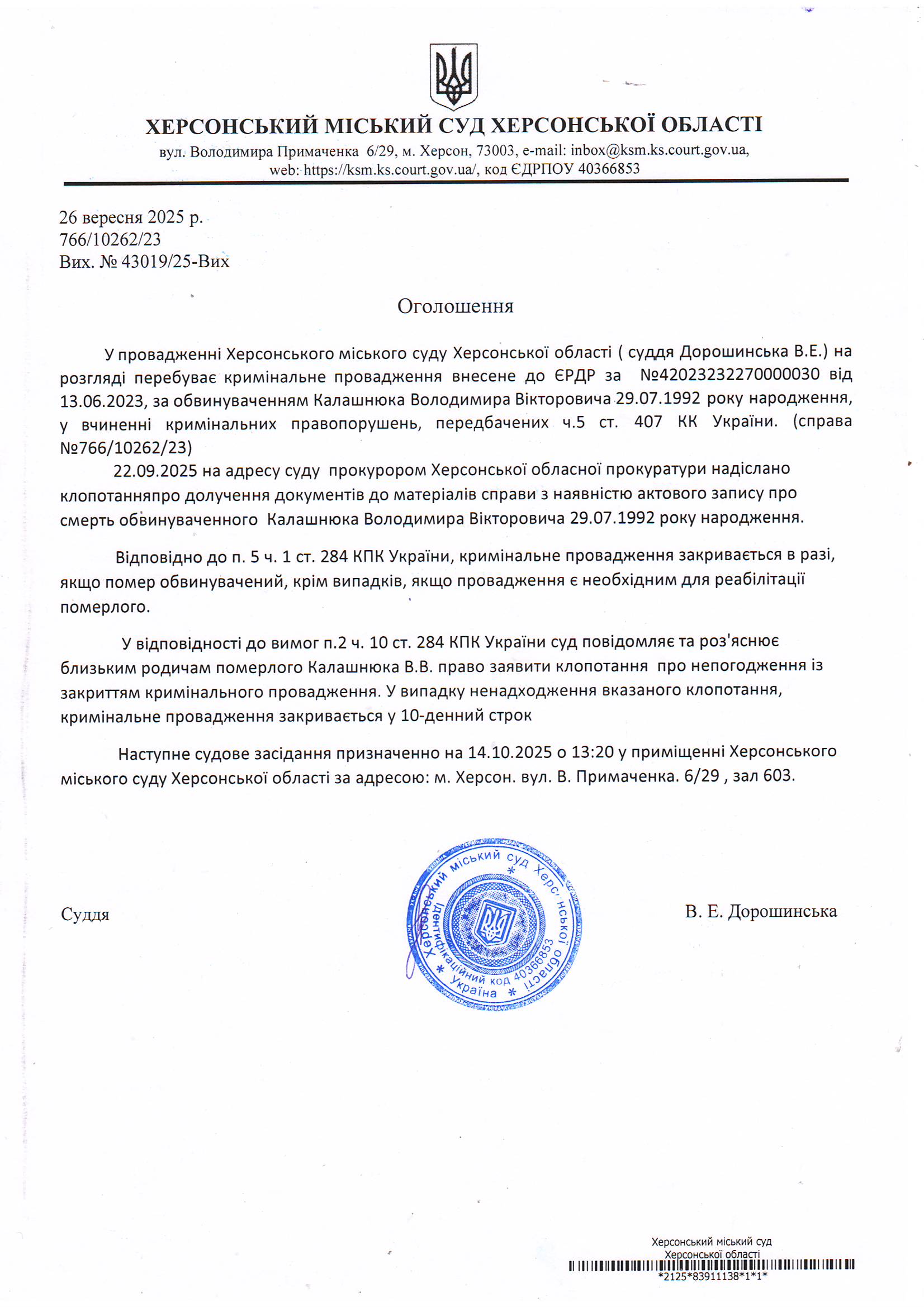 Оголошення про закриття кримінального провадження у відношенні Калашнюка Володимира Вікторовича