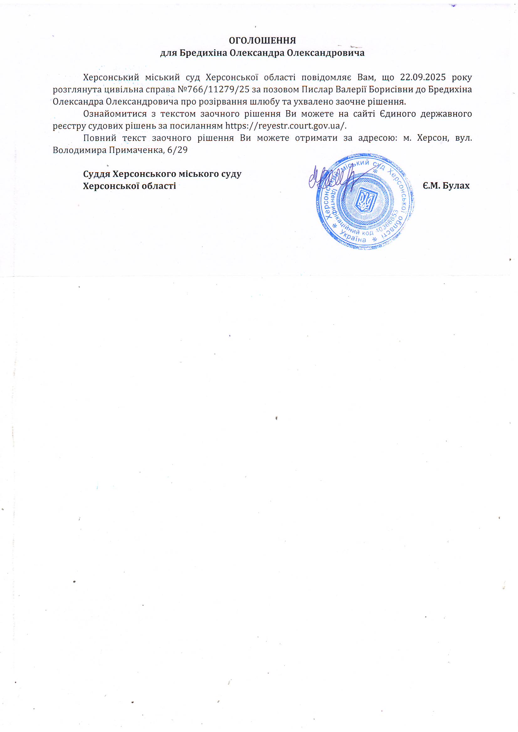 Оголошення для Бредихіна Олександра Олександровича про ухвалення заочного рішення