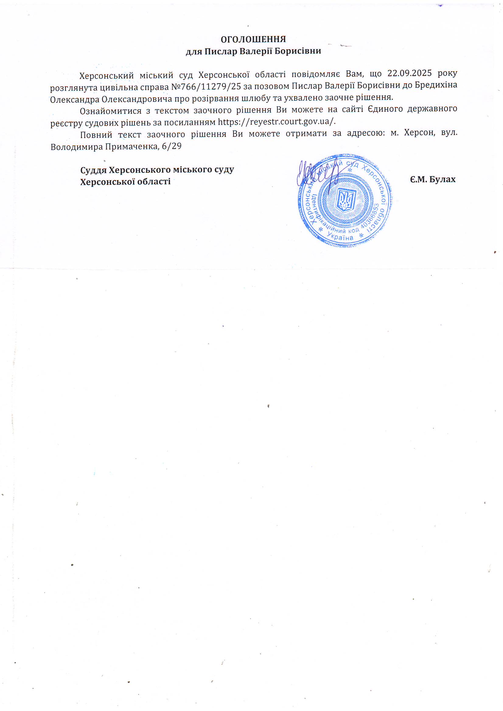 Оголошення для Пислар Валерії Борисівни про ухвалення заочного рішення