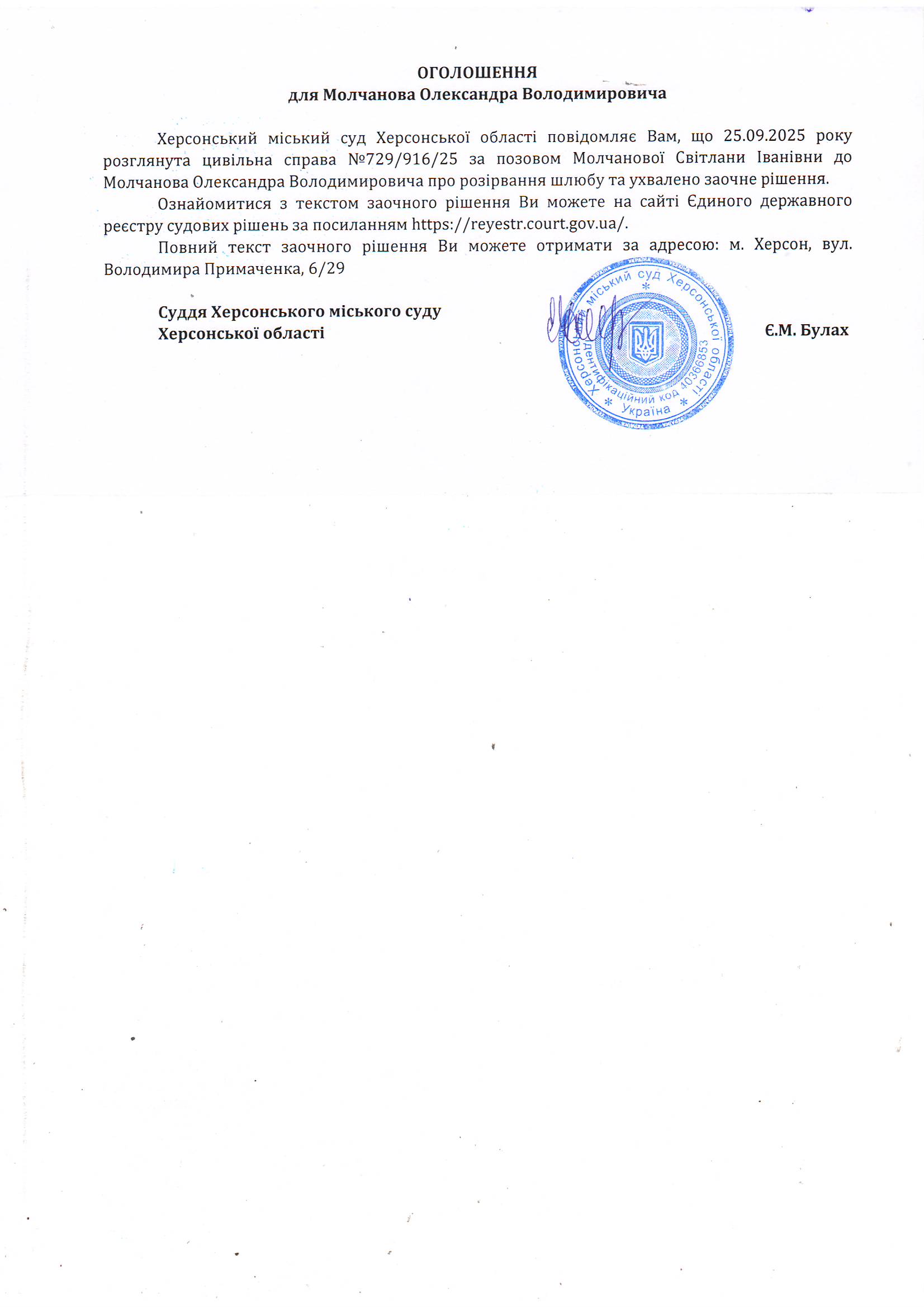 Оголошення для Молчанова Олександра Володимировича про ухвалення заочного рішення