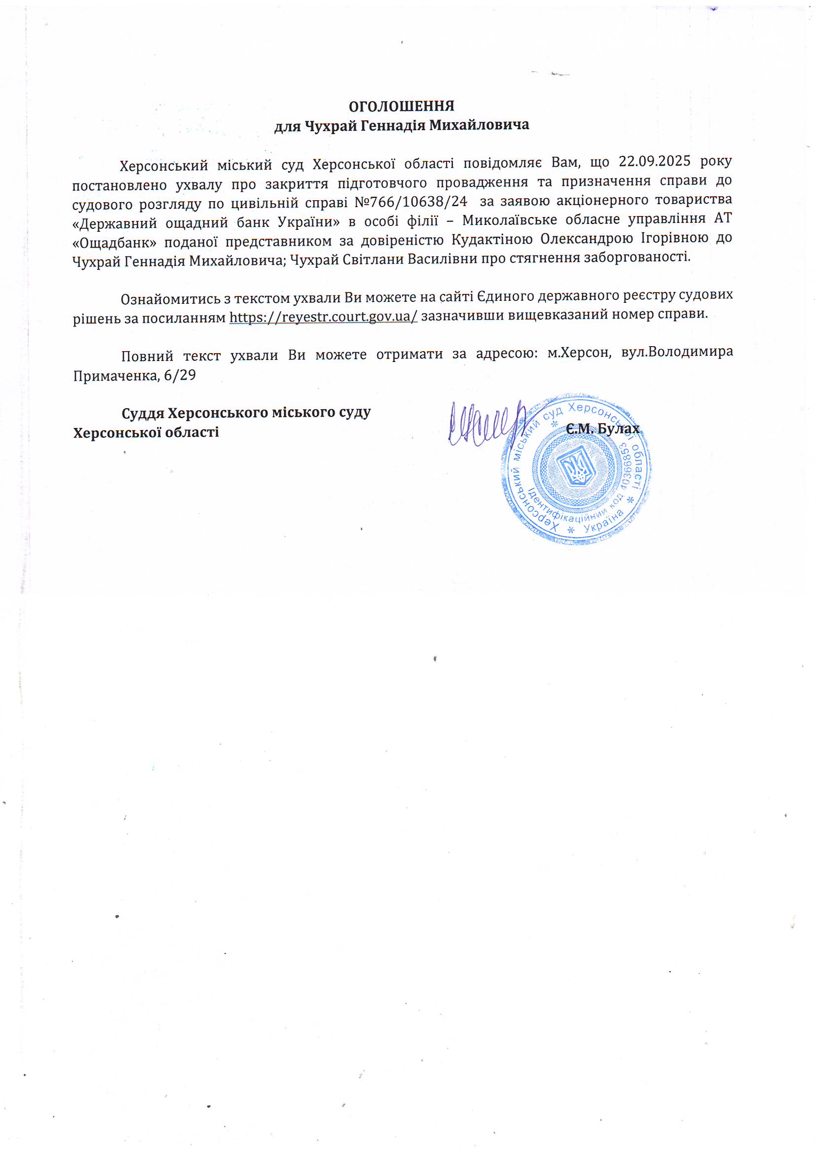 Оголошення для Чухрая Геннадія Михайловича про постановлення ухвали