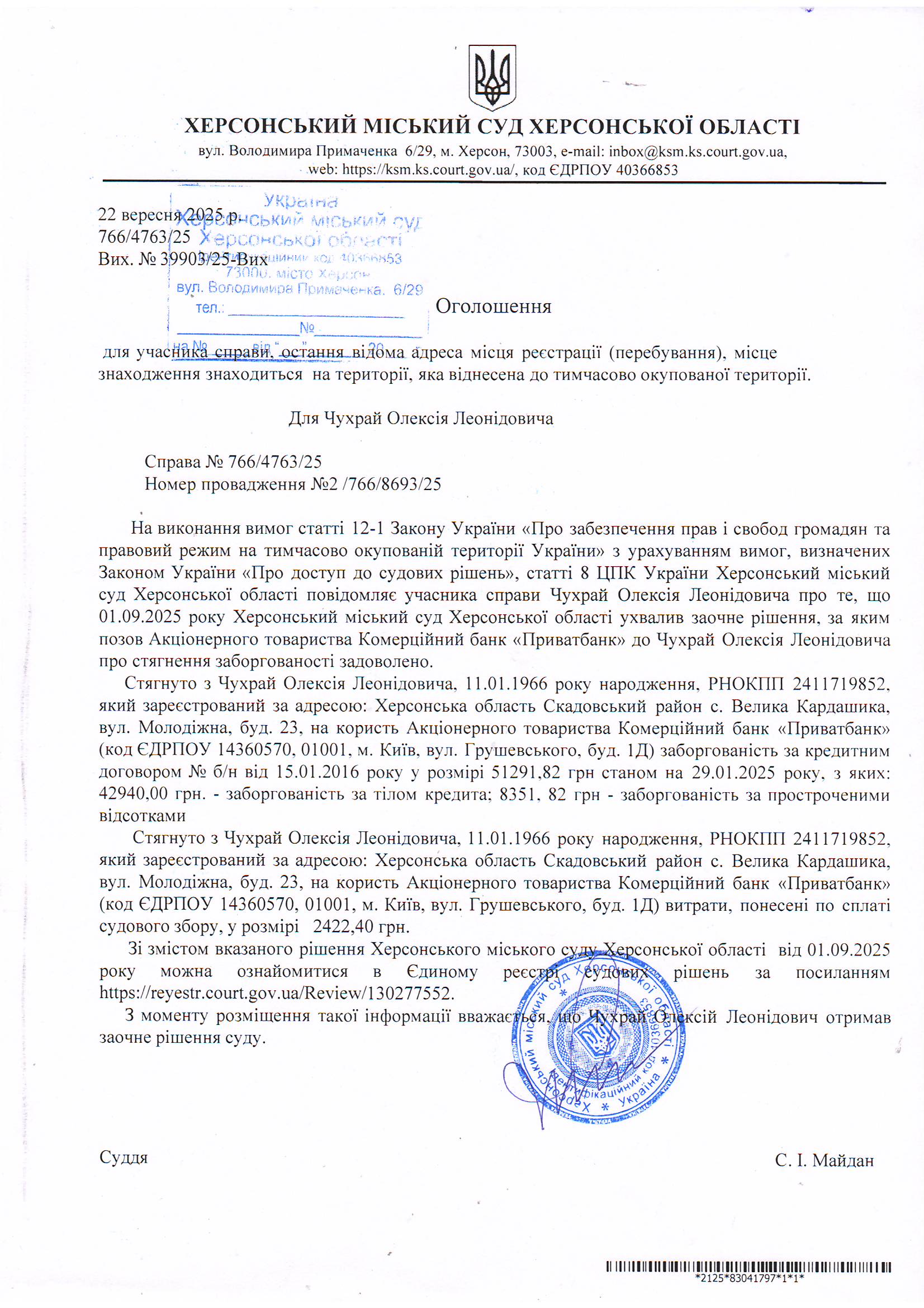 Оголошення для Чухрая Олексія Леонідовича про ухвалення заочного рішення