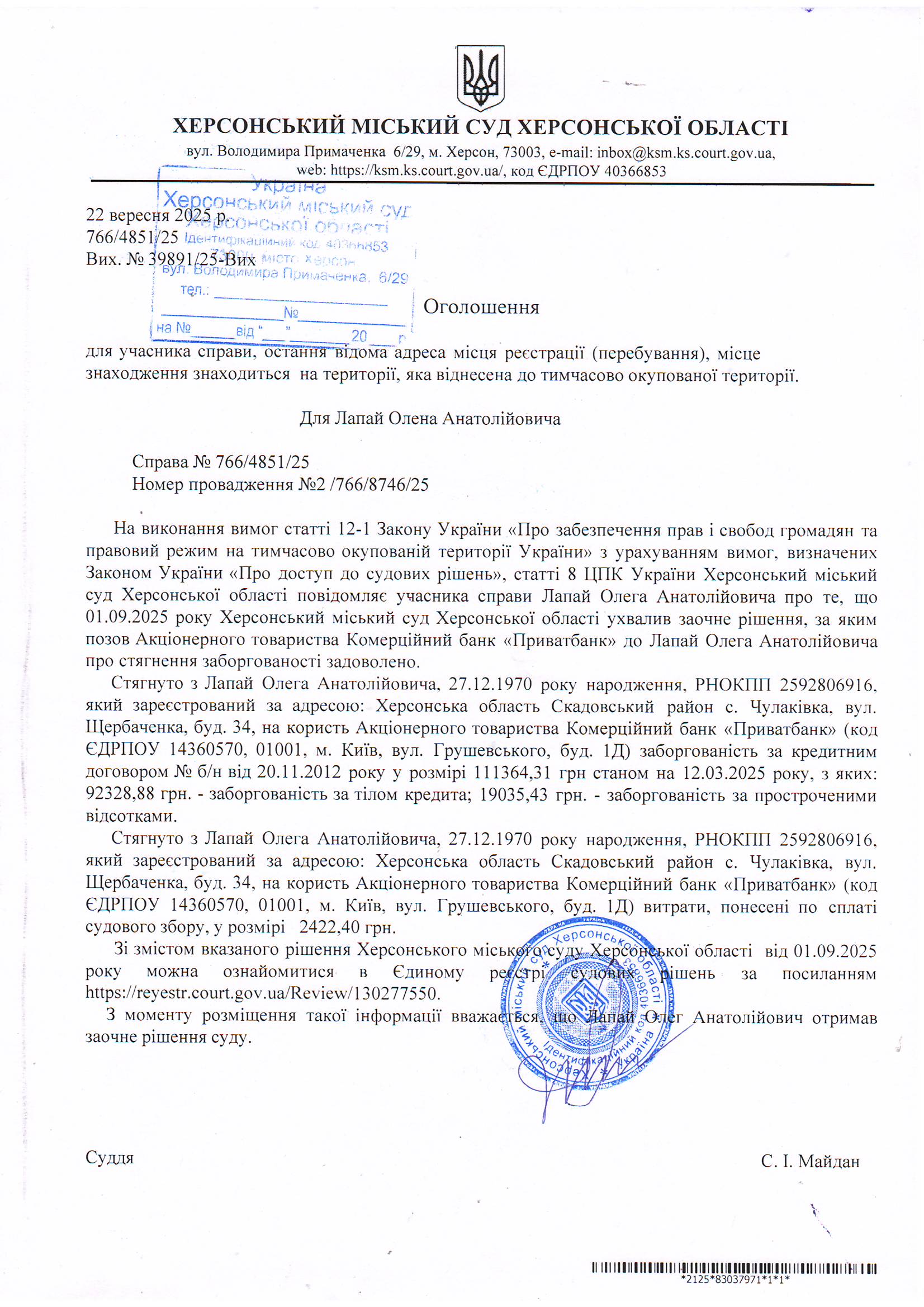 Оголошення для Лапая Олега Анатолійовичапро ухвалення заочного рішення