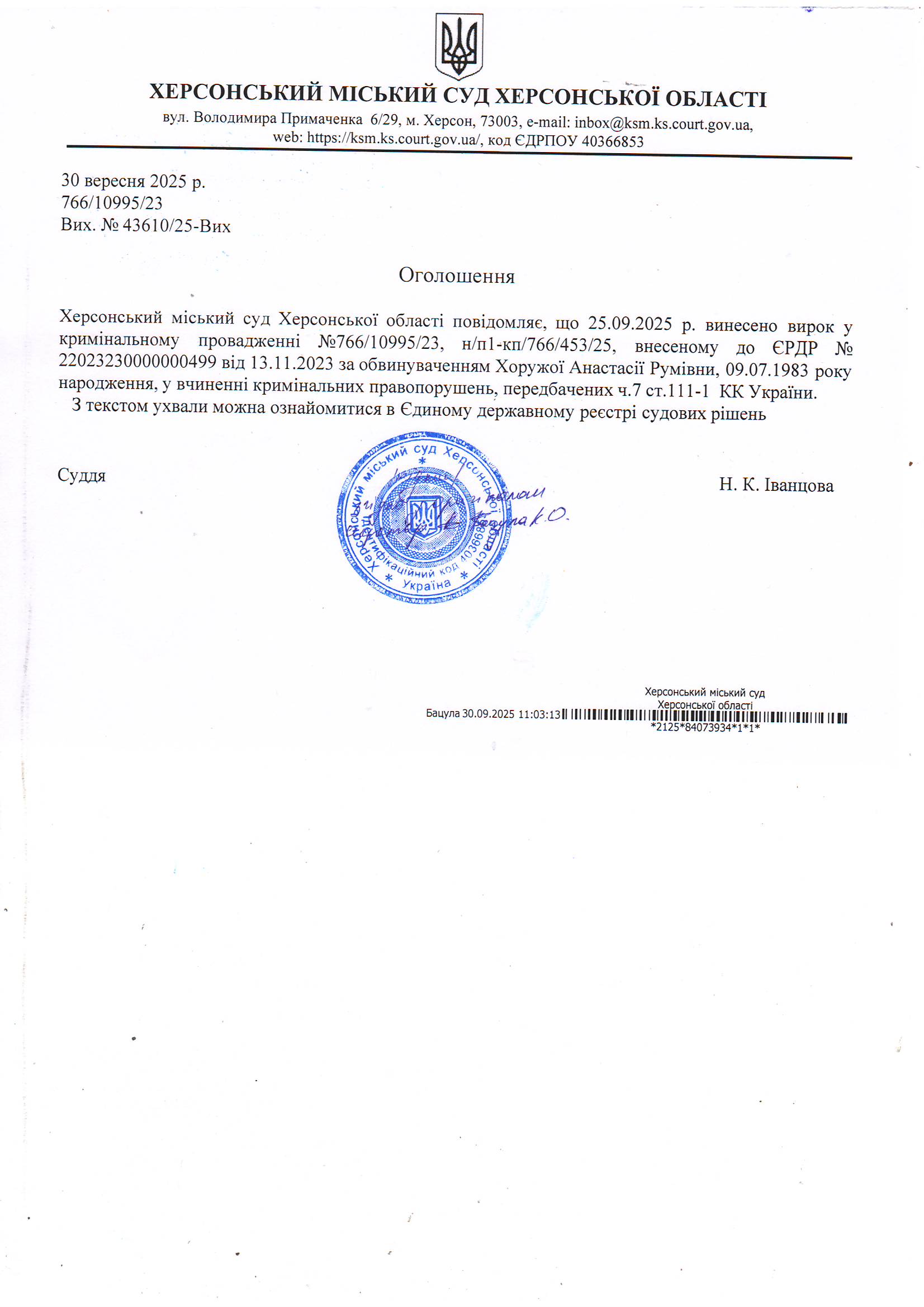 Оголошення для Хоружої Анастасії Румівни про винесення вироку
