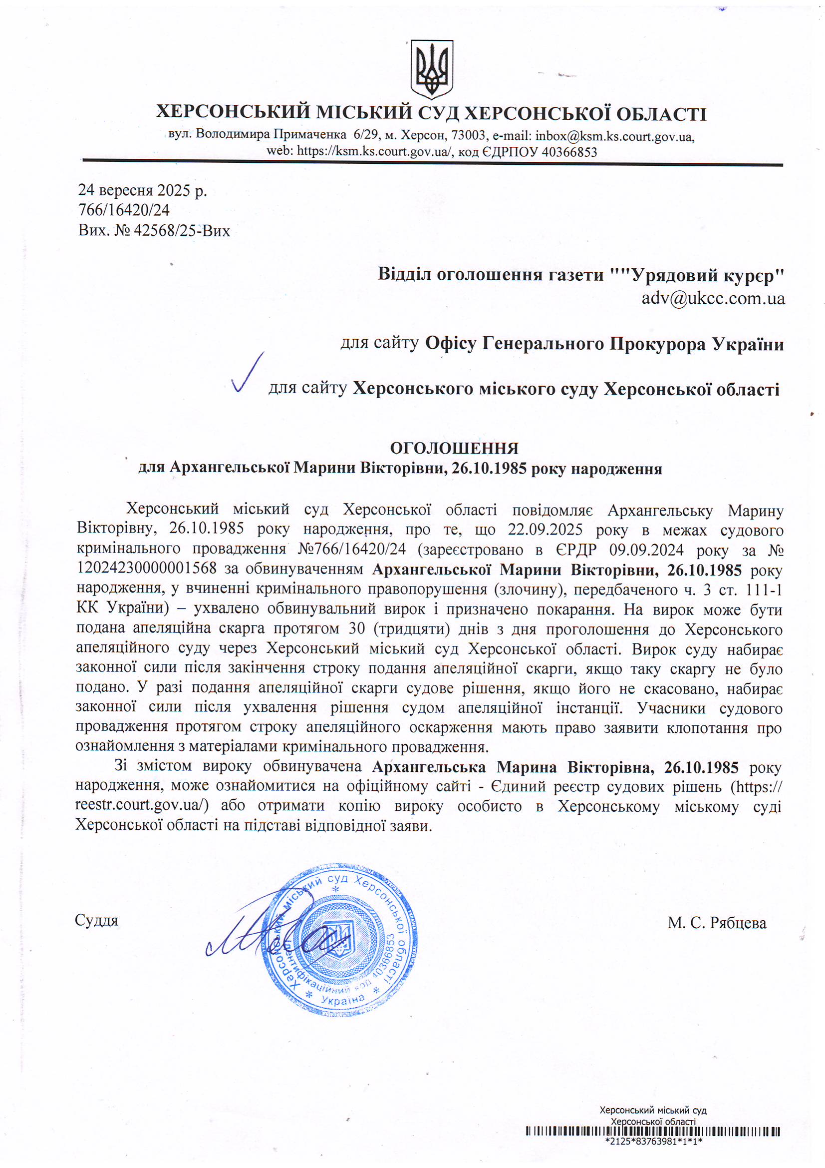 Оголошення для Архангельської Марини Вікторівни про ухвалення вироку