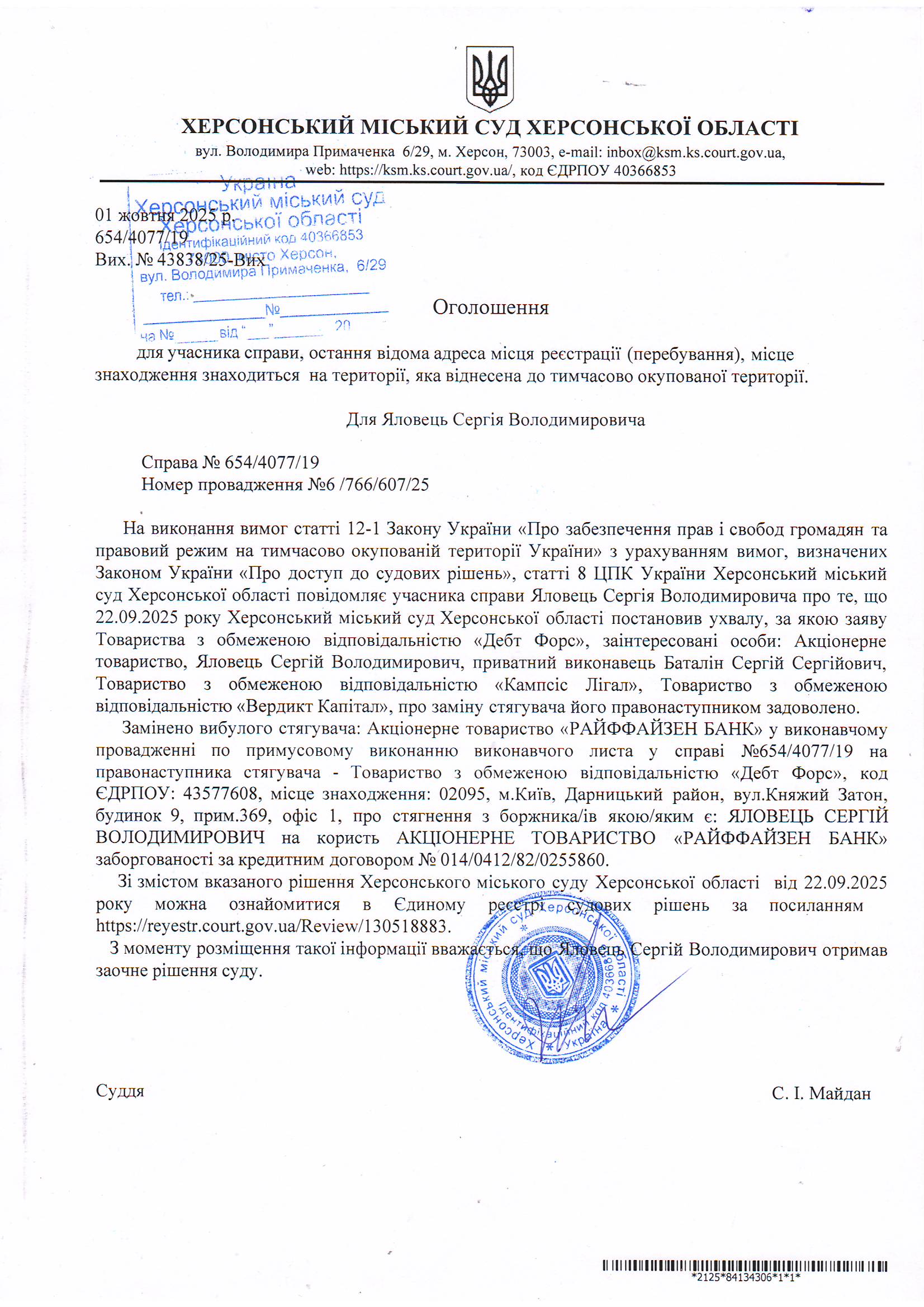 Оголошення для Яловця Сергія Володимировича про постановлення ухвали