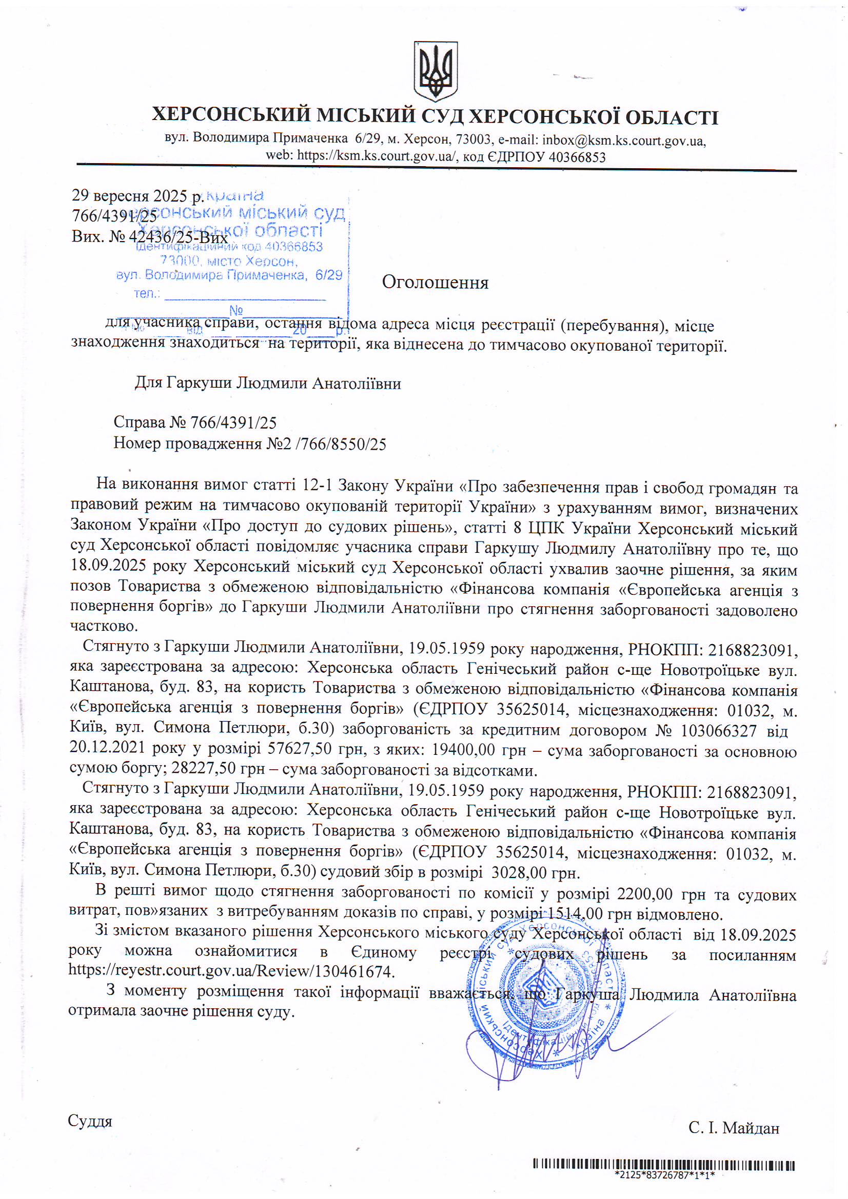 Оголошення для Гаркуши Людмили Анатоліївни про постановлення ухвали