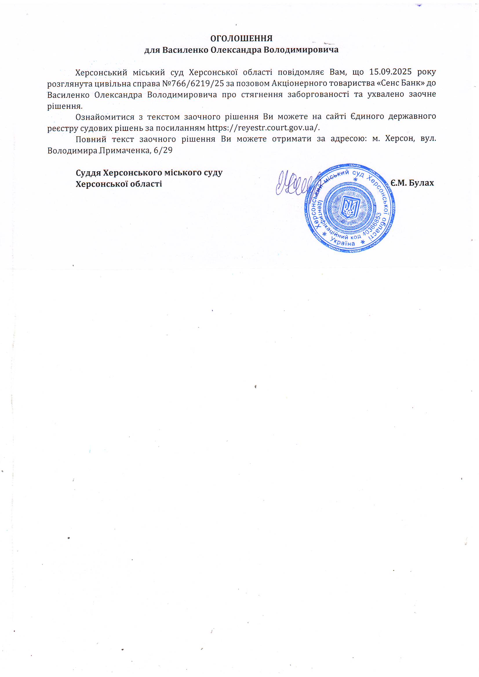 Оголошення для Василенка Олександра Володимировича про ухвалення заочного рішення