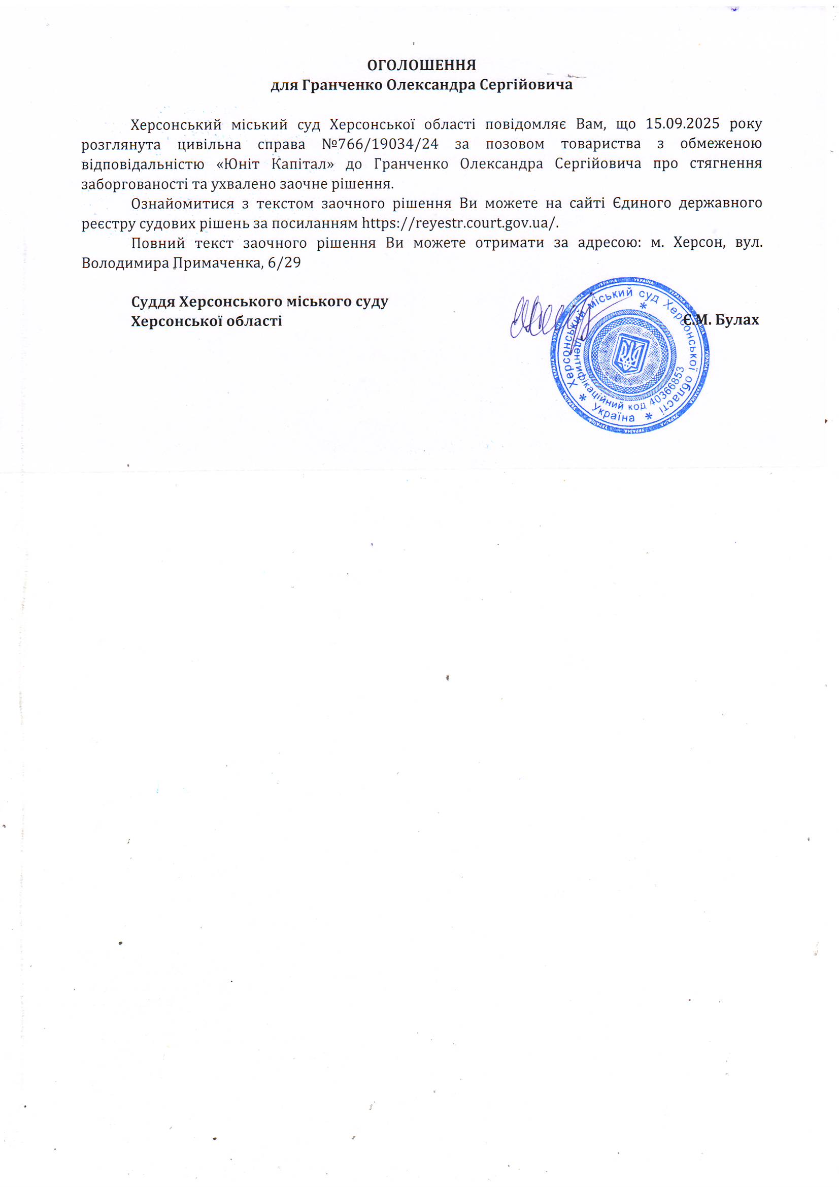 Оголошення для Гранченка Олександра Сергійовича про ухвалення заочного рішення