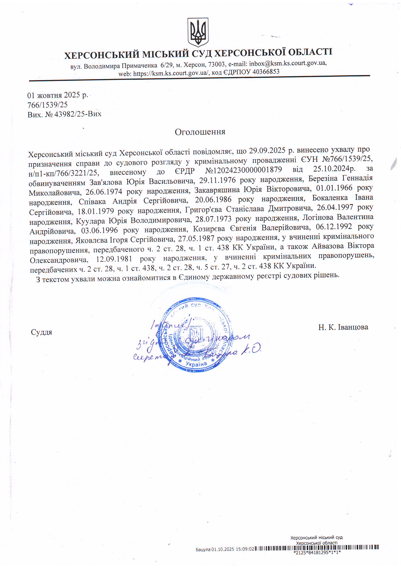 Оголошення для Зав'ялова Ю.В., Березіна Г.М., Закавряшина Ю.В., Співака А.С., Бокаленка І.С., Григор'єва С.Д., Куулара Ю.В., Логінова В.А., Козирєва Є.В., Яковлєва І.С., Айвазова В.О. про винесення ухвали