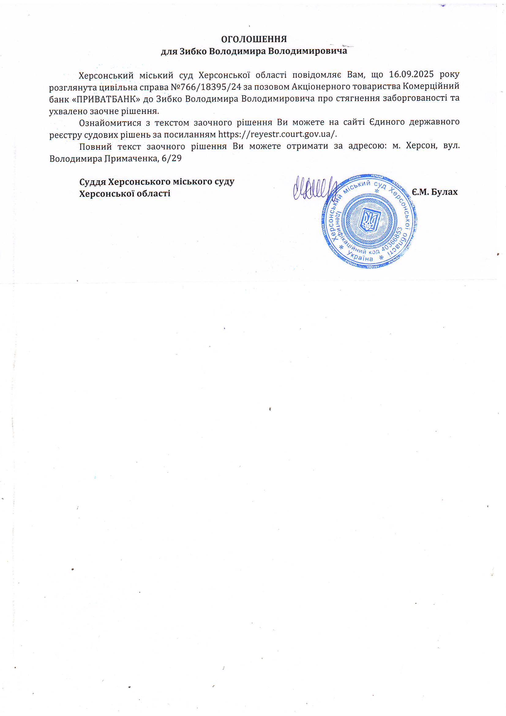 Оголошення для Зибка Володимира Володимировича про ухвалення заочного рішення
