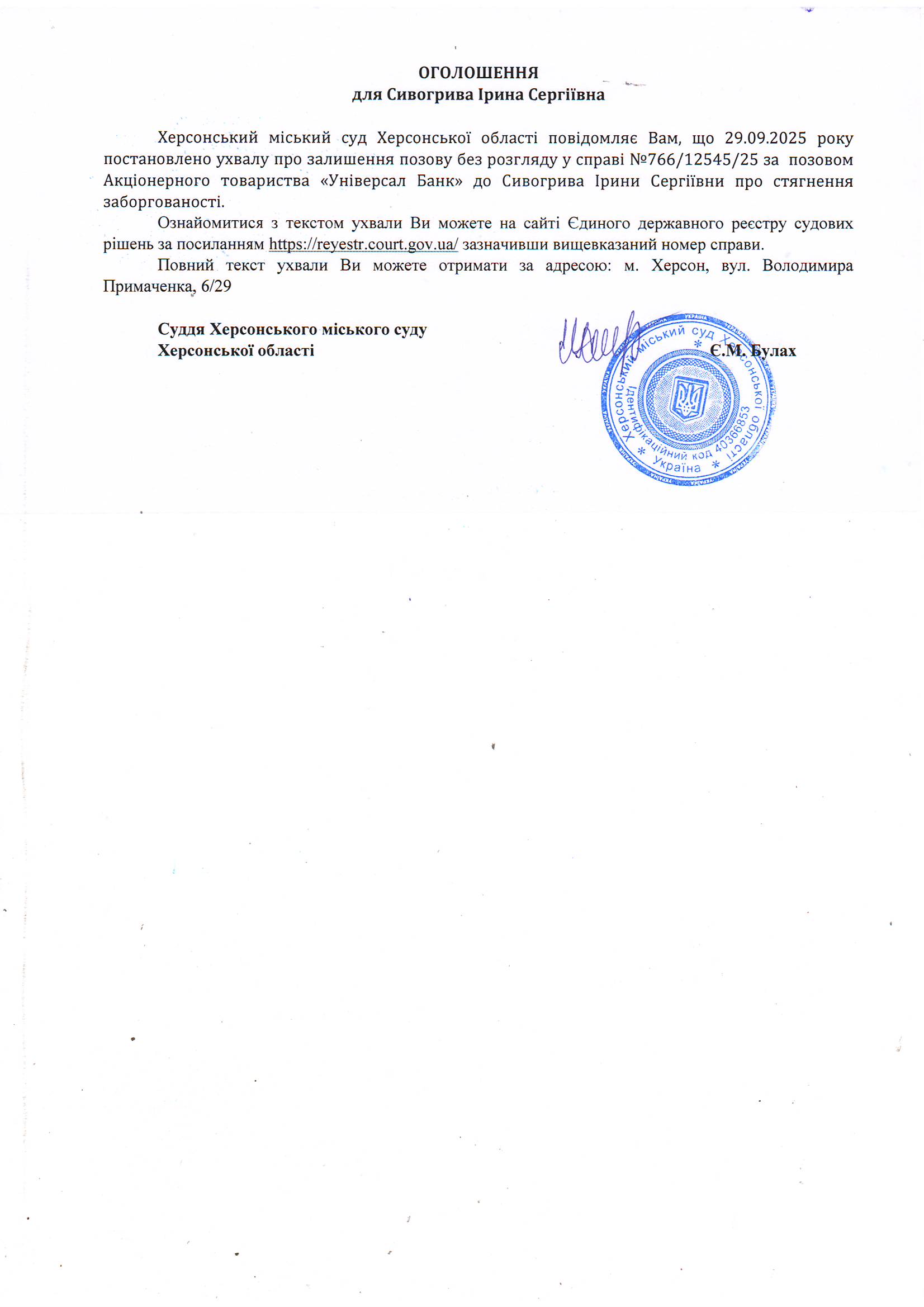 Оголошення для Сивогриви Ірини Сергіївни про постановлення ухвали