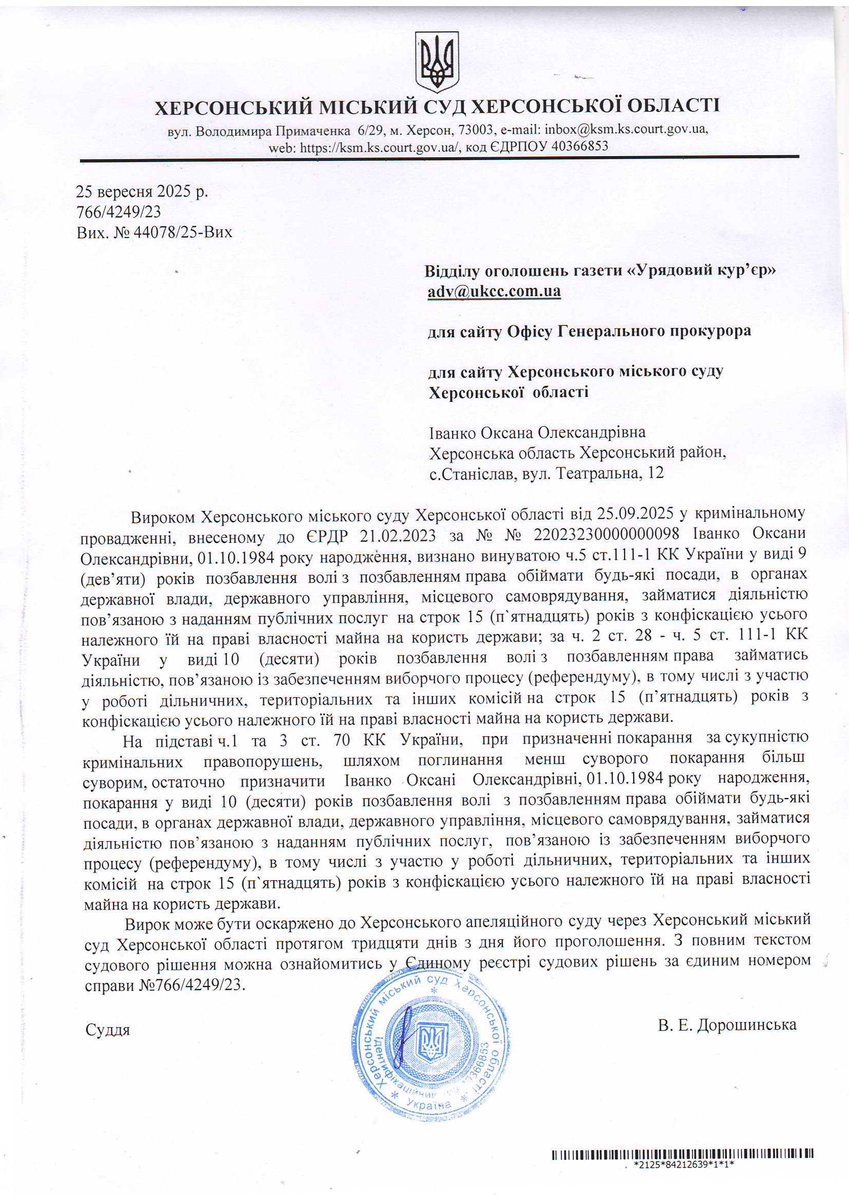 Оголошення для Іванко Оксани Олександрівни про ухвалення вироку