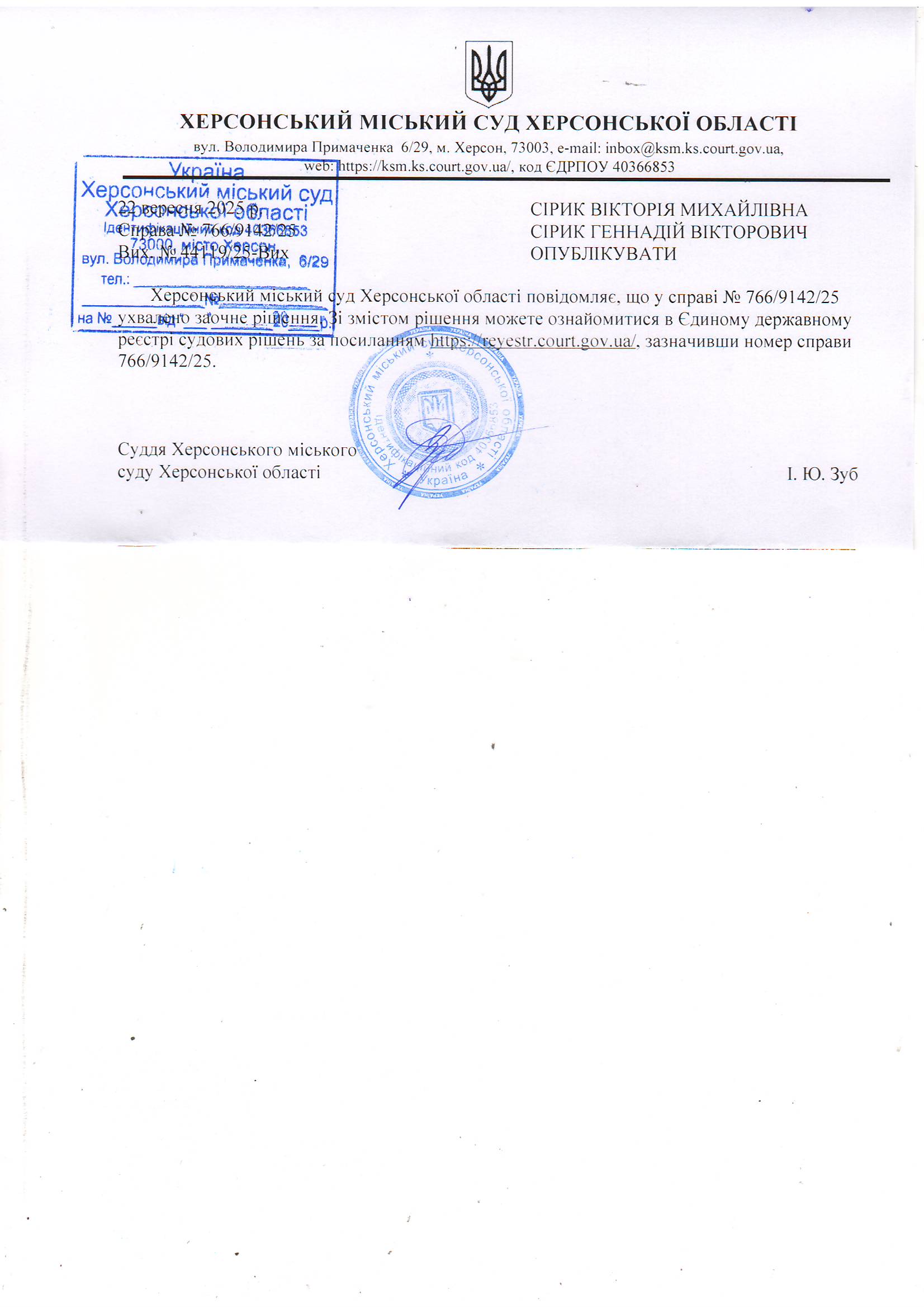 Оголошення для Сірик Вікторії Михайлівни, Сірика Геннадія Вікторовича про ухвалення заочного рішення