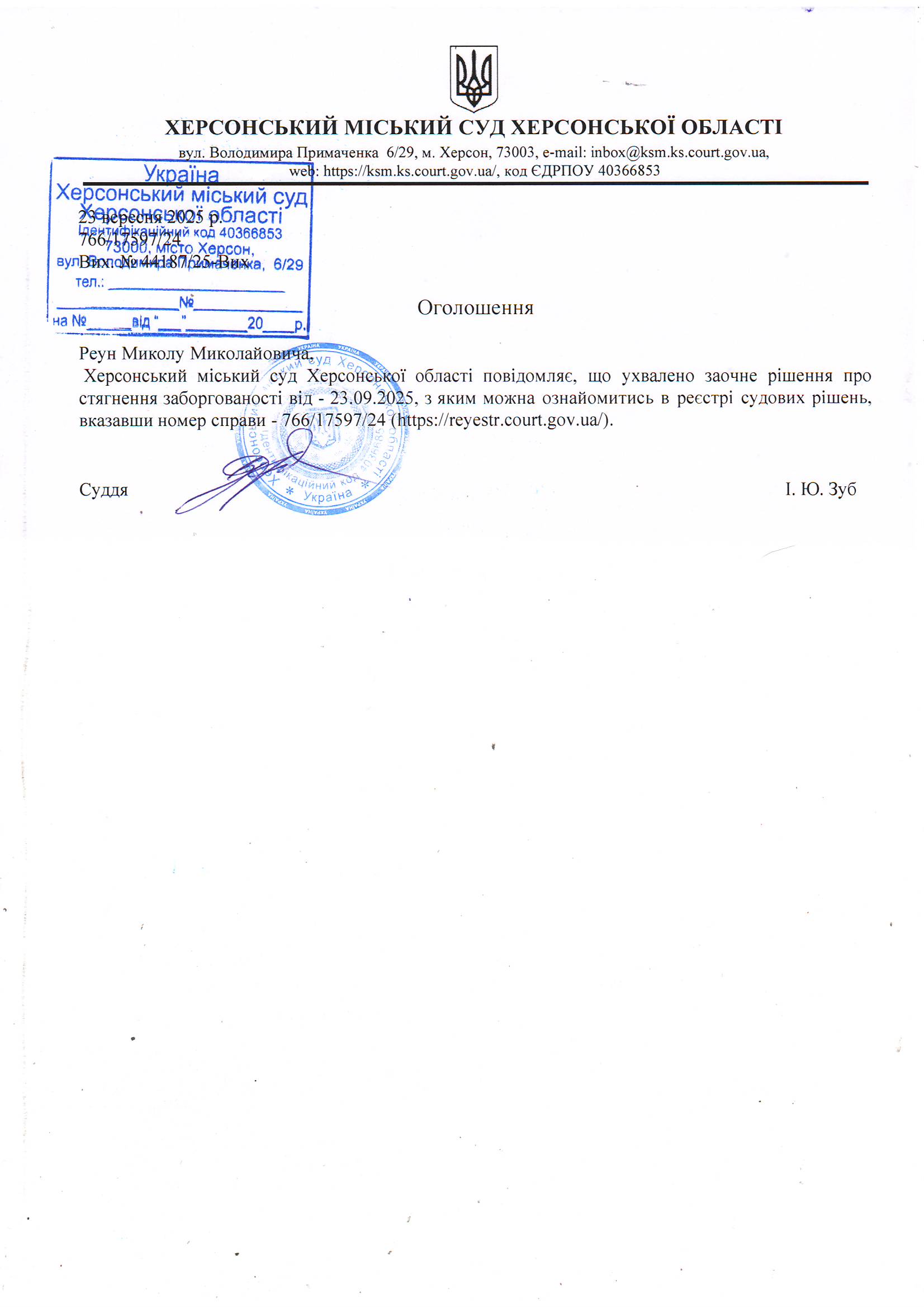 Оголошення для Реуна Миколи Миколайовича про ухвалення заочного рішення