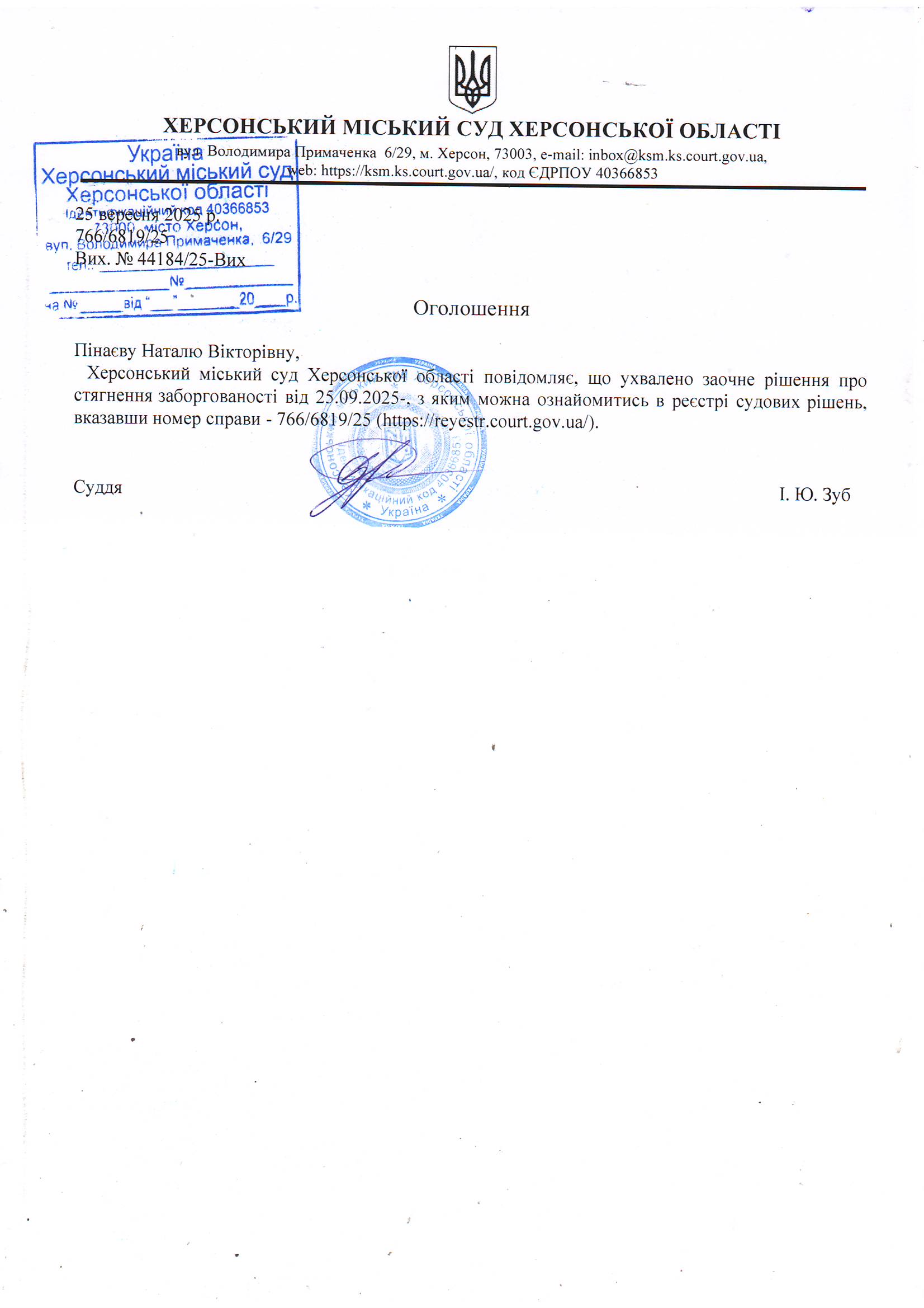 Оголошення для Пінаєвої Наталі Вікторівни про ухвалення заочного рішення