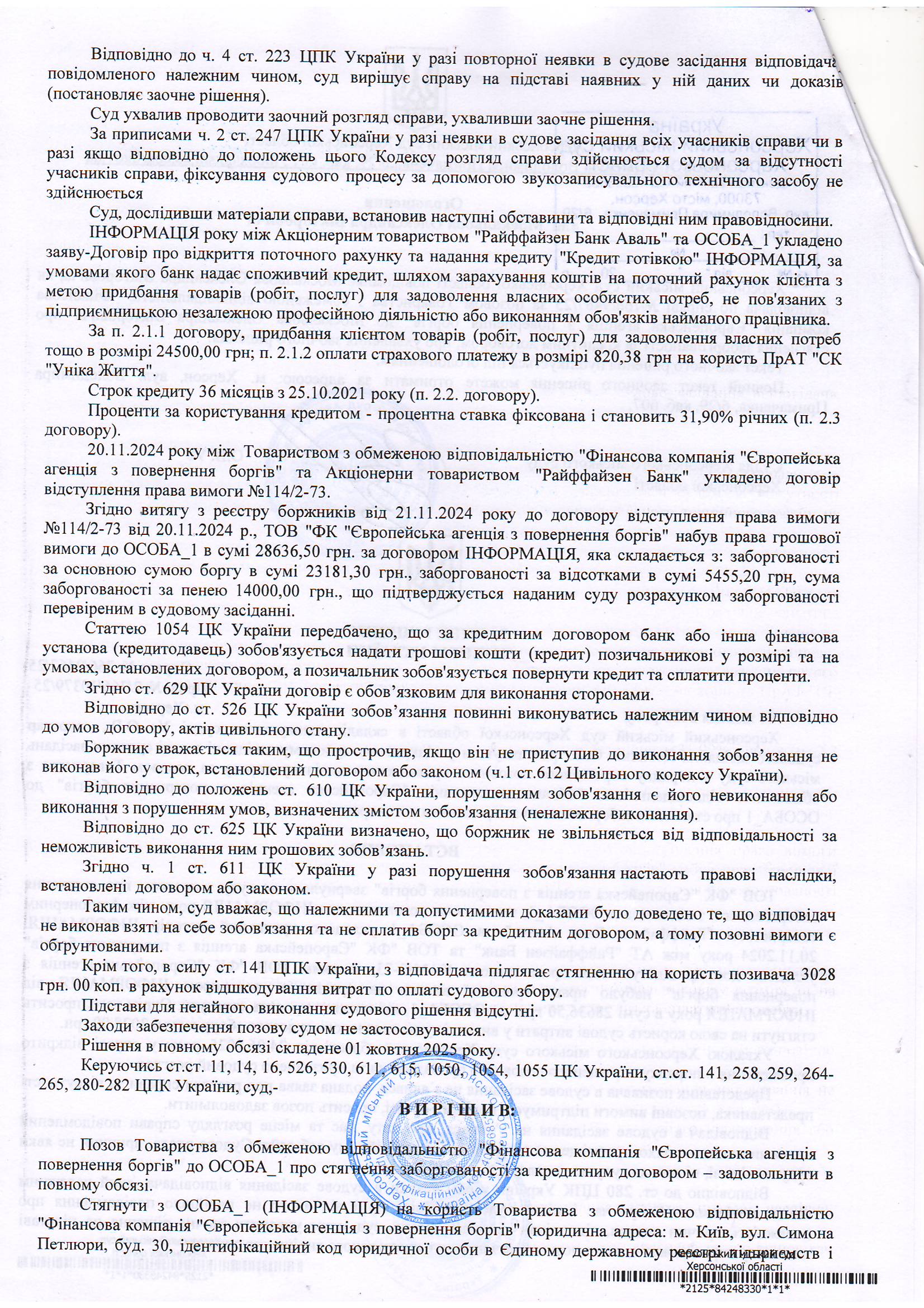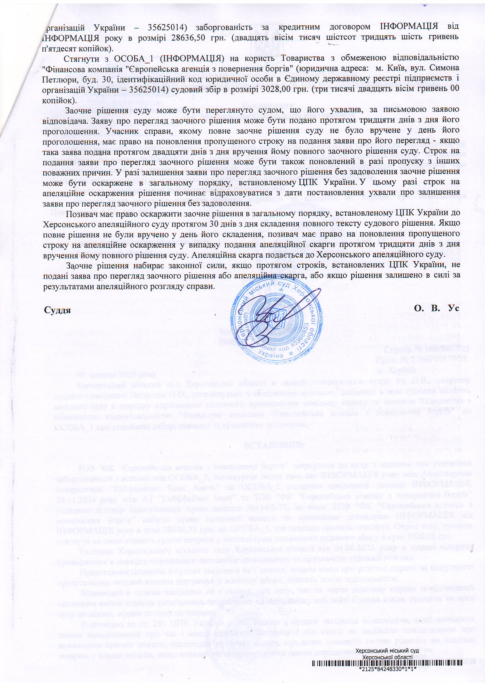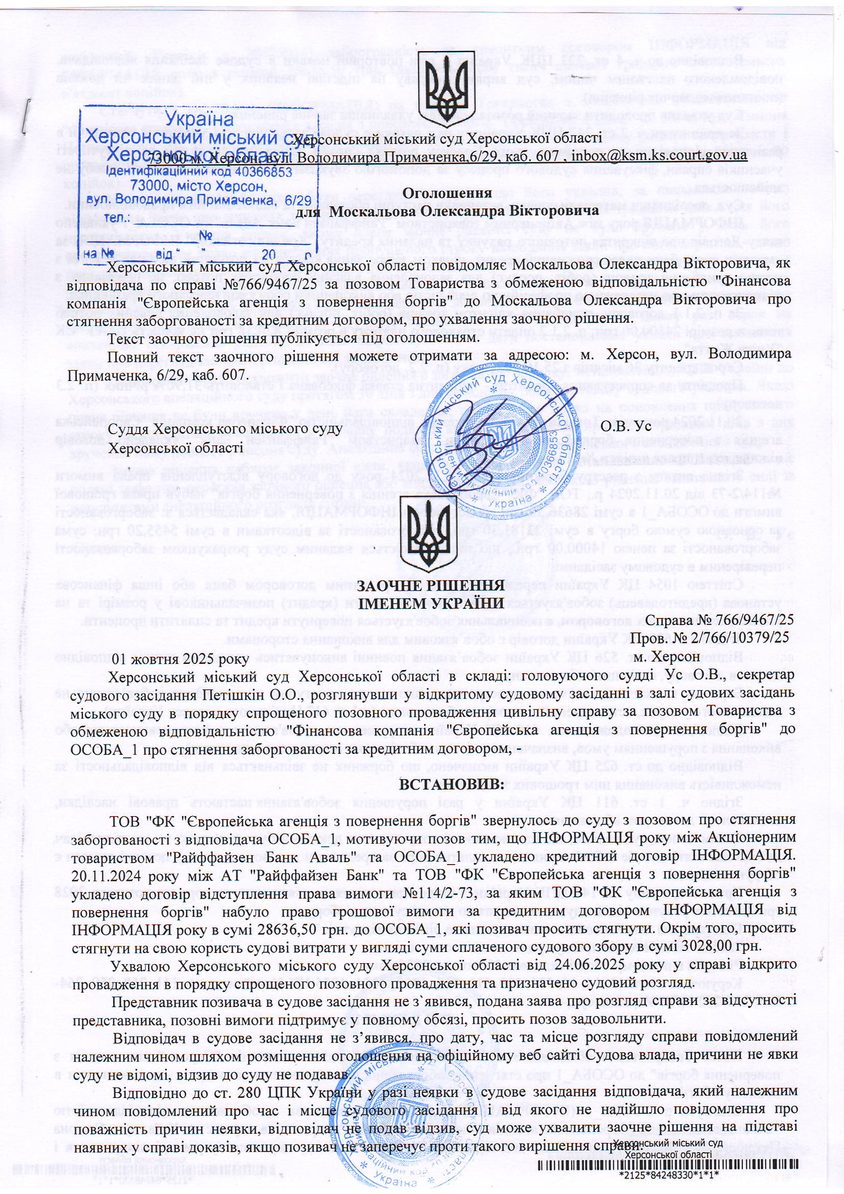 Оголошення для Москальова Олександра Вікторовича про ухвалення заочного рішення