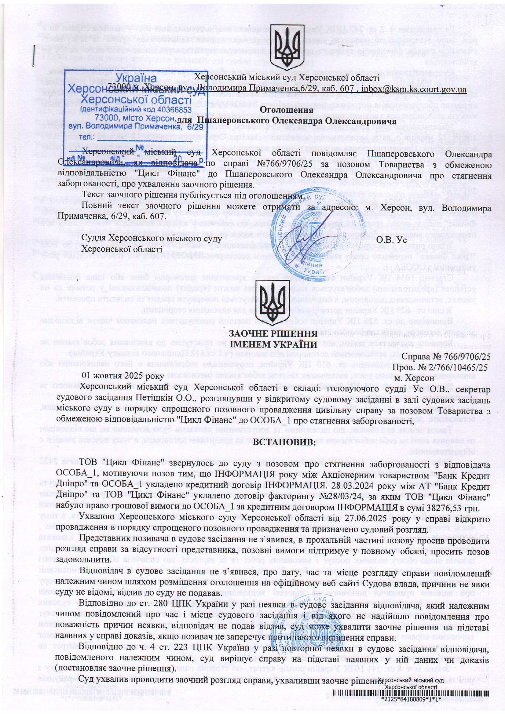 Оголошення для Пшаперовського Олександра Олександровича про ухвалення заочного рішення