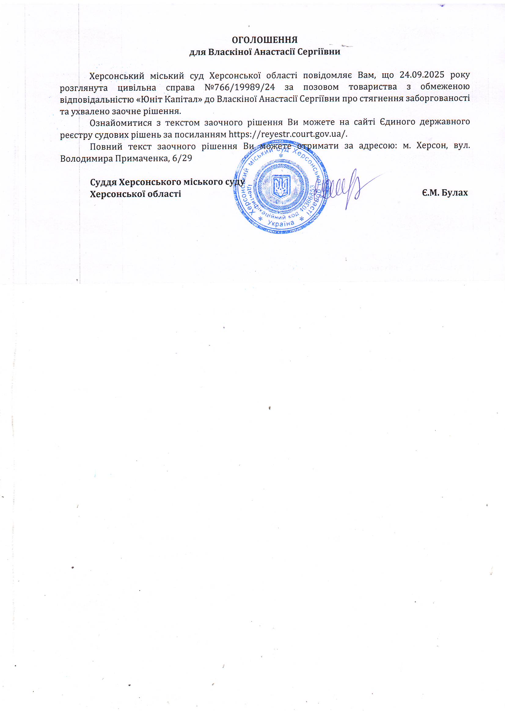 Оголошення для Власкіної Анастасії Сергіївни про ухвалення заочного рішення