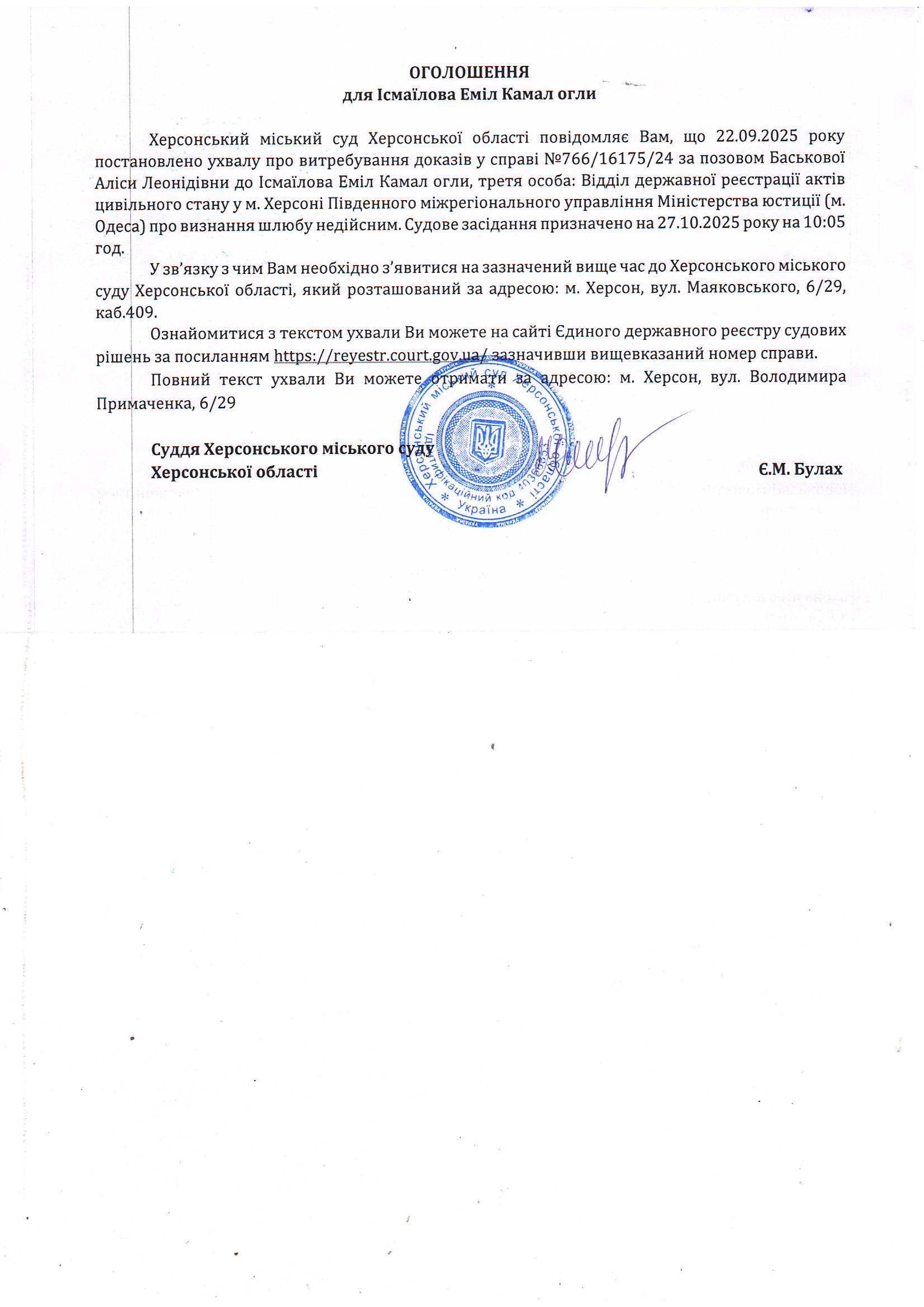 Оголошення для Ісмаілова Еміл Камала огли про постановлення ухвали