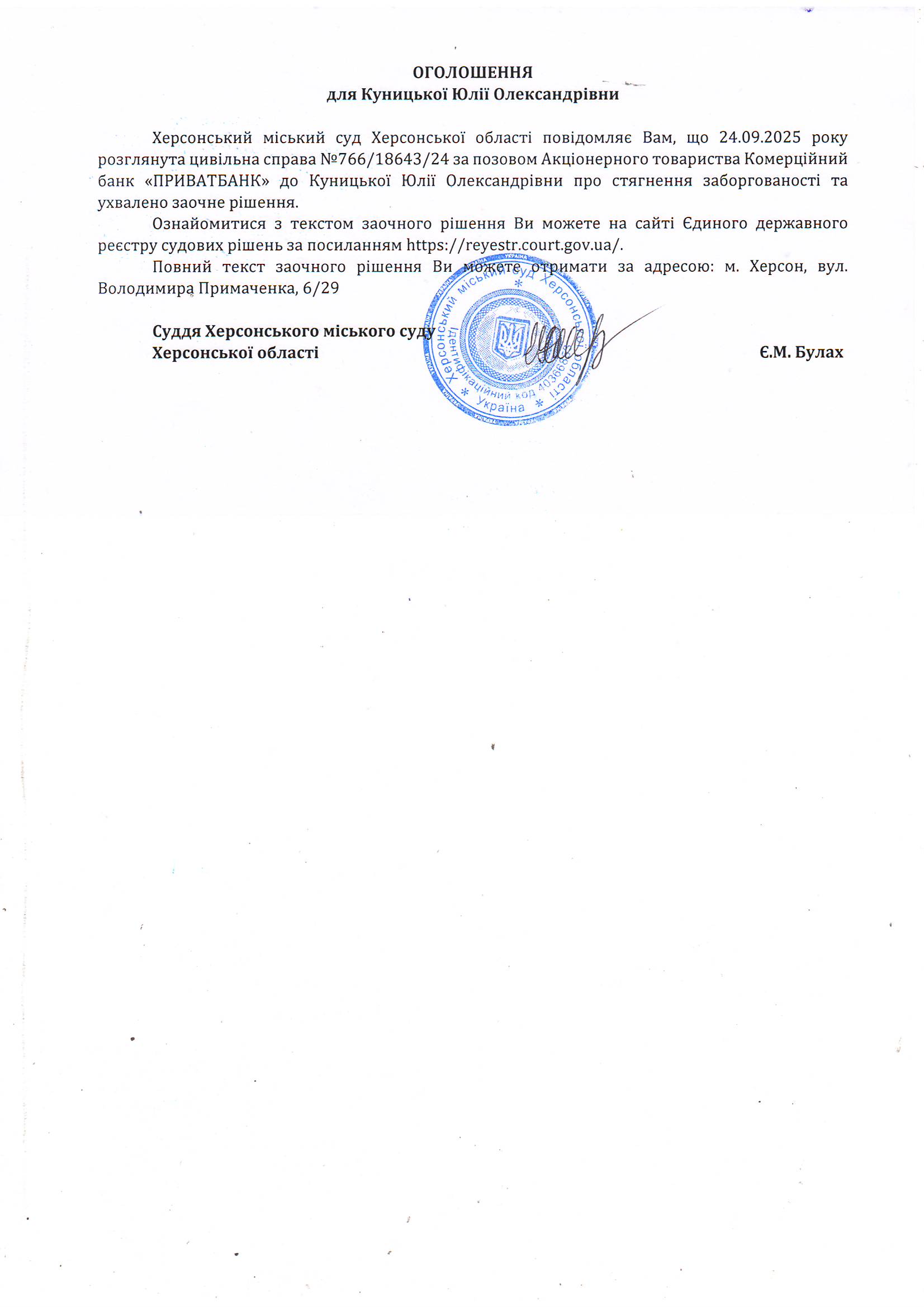 Оголошення для Куницької Юлії Олександрівни про ухвалення заочного рішення
