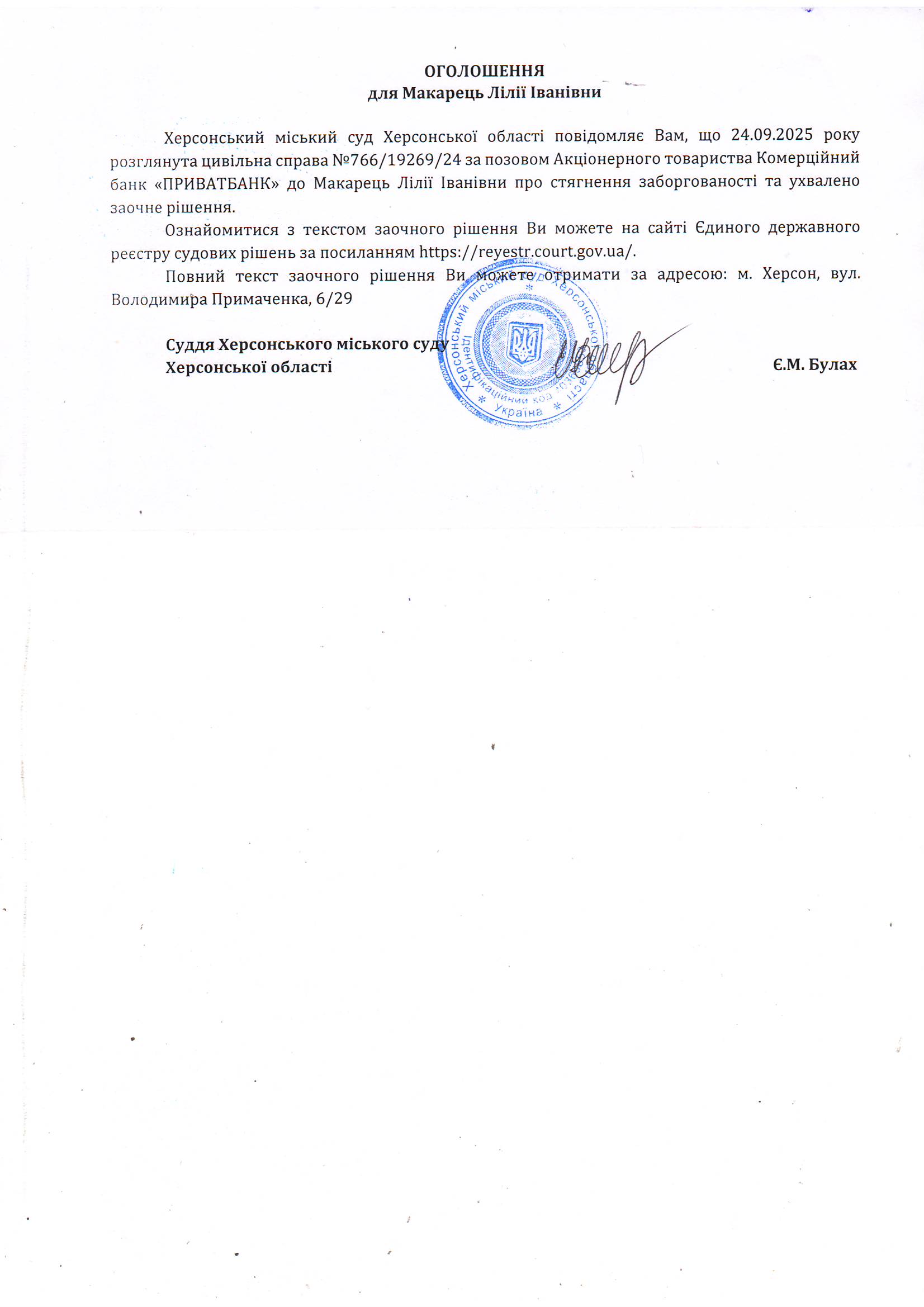 Оголошення для Макарець Лілії Іванівни про ухвалення заочного рішення